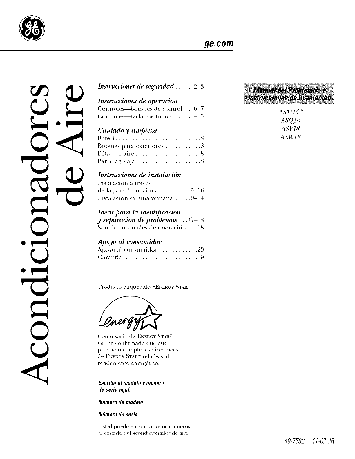 User Manual: GE ASM14ALS1 ASM14ALS1 GE ROOM AIR CONDITIONER - Manuals and Guides View the owners manual for your GE ROOM AIR CONDITIONER #ASM14ALS1. Home:Heating & Cooling Parts:GE Parts:GE ROOM AIR CONDITIONER Manual