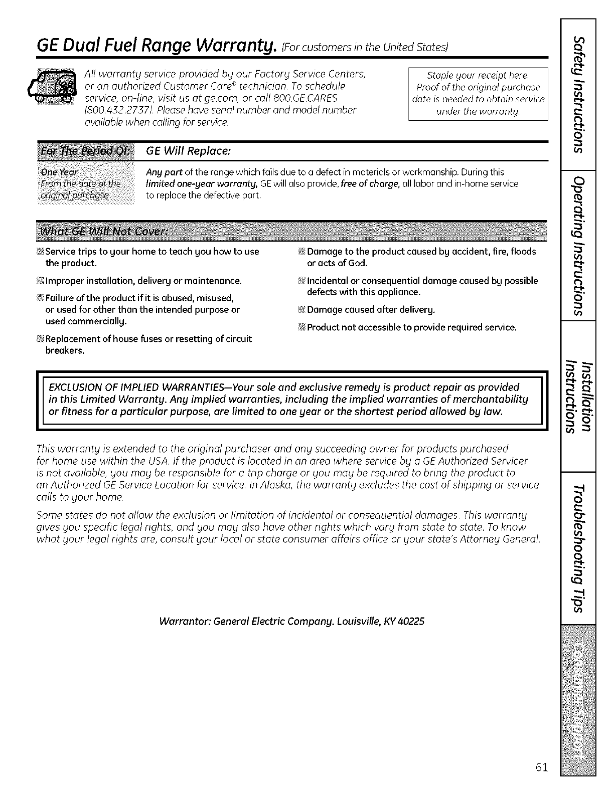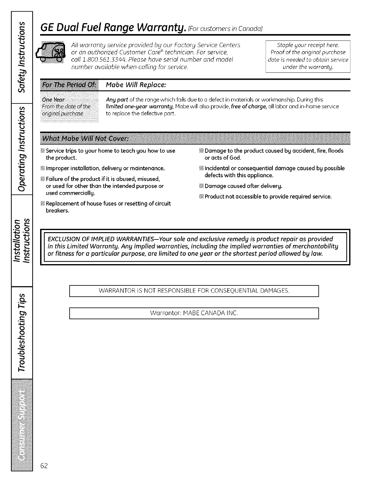 GEDual Fuel Range Warrantg. ImrcustomersinCanada)