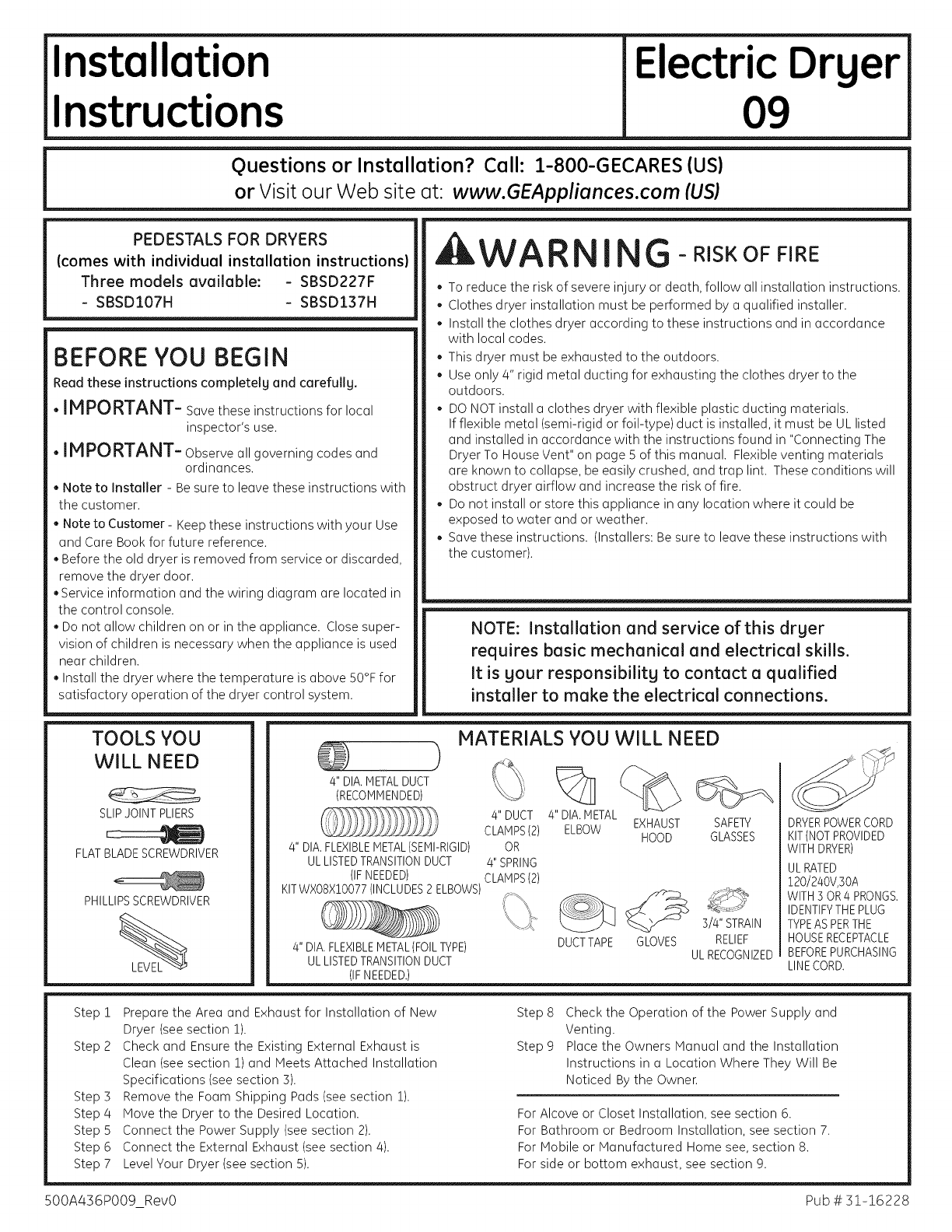 GE Residential Dryer Manual L0908200 GE Residential Dryer Owner's Manual, GE Residential Dryer installation guides