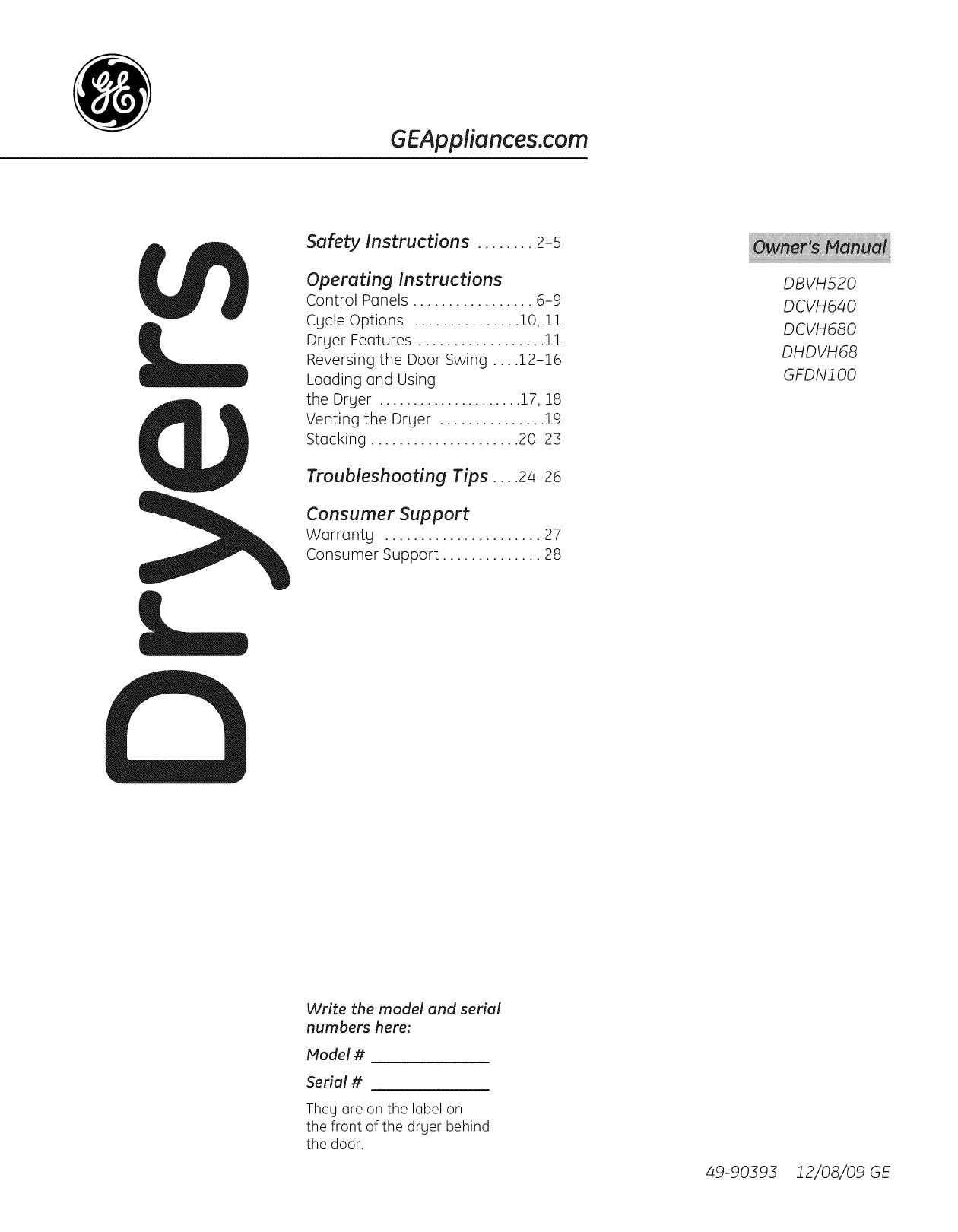 User Manual: GE DBVH520GJ3WW DBVH520GJ3WW GE GAS DRYER - Manuals and Guides View the owners manual for your GE GAS DRYER #DBVH520GJ3WW. Home:Laundry & Garment Care Parts:GE Parts:GE GAS DRYER Manual