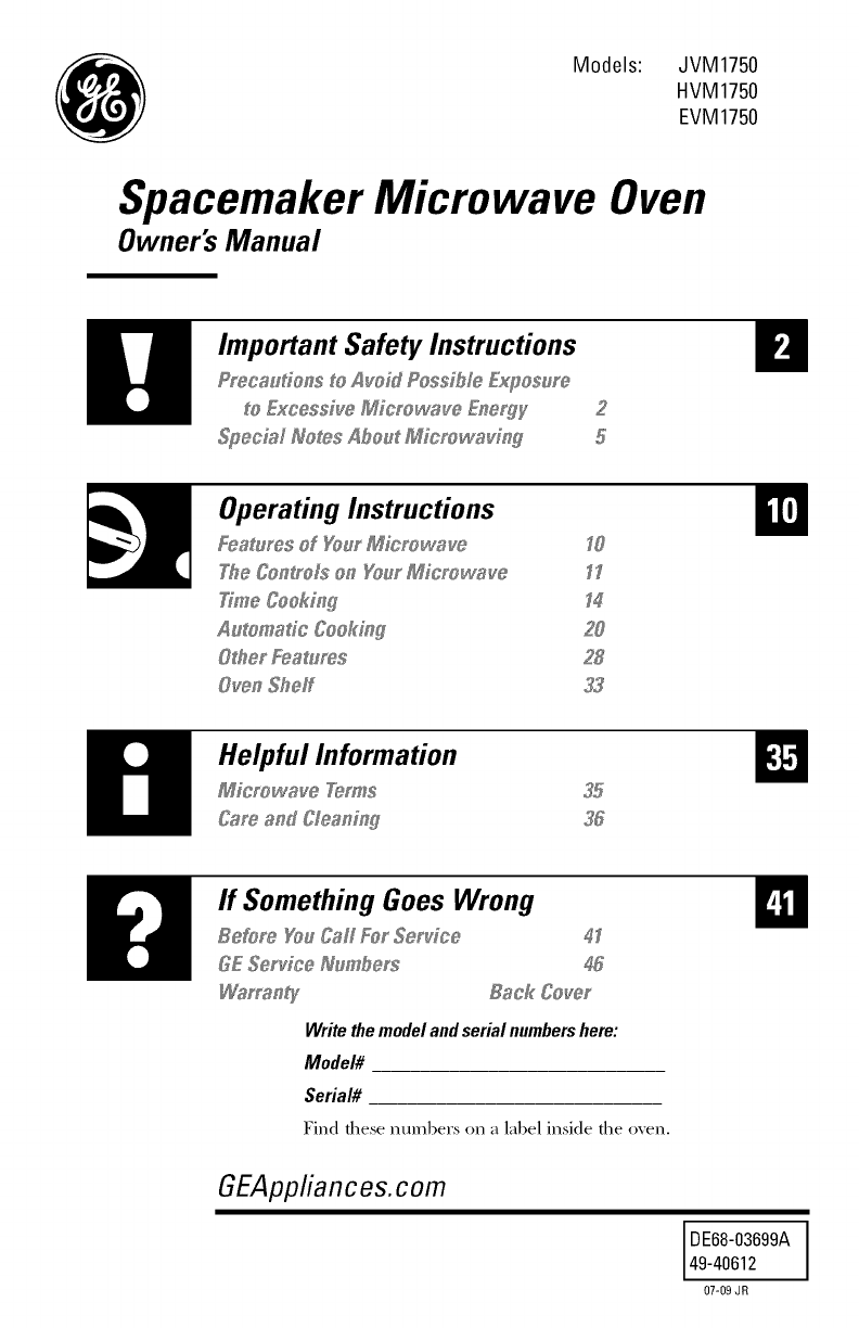 GE EVM1750DP1BB User Manual MICROWAVE Manuals And Guides L1002509