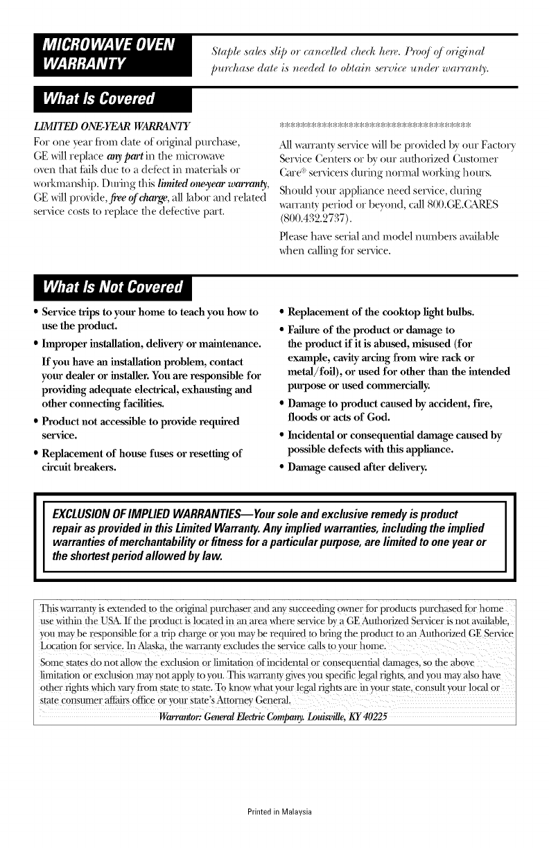 use within the USA. If the produc! is located in an area where service by a GE Authorized Servicer is not avzdlable.