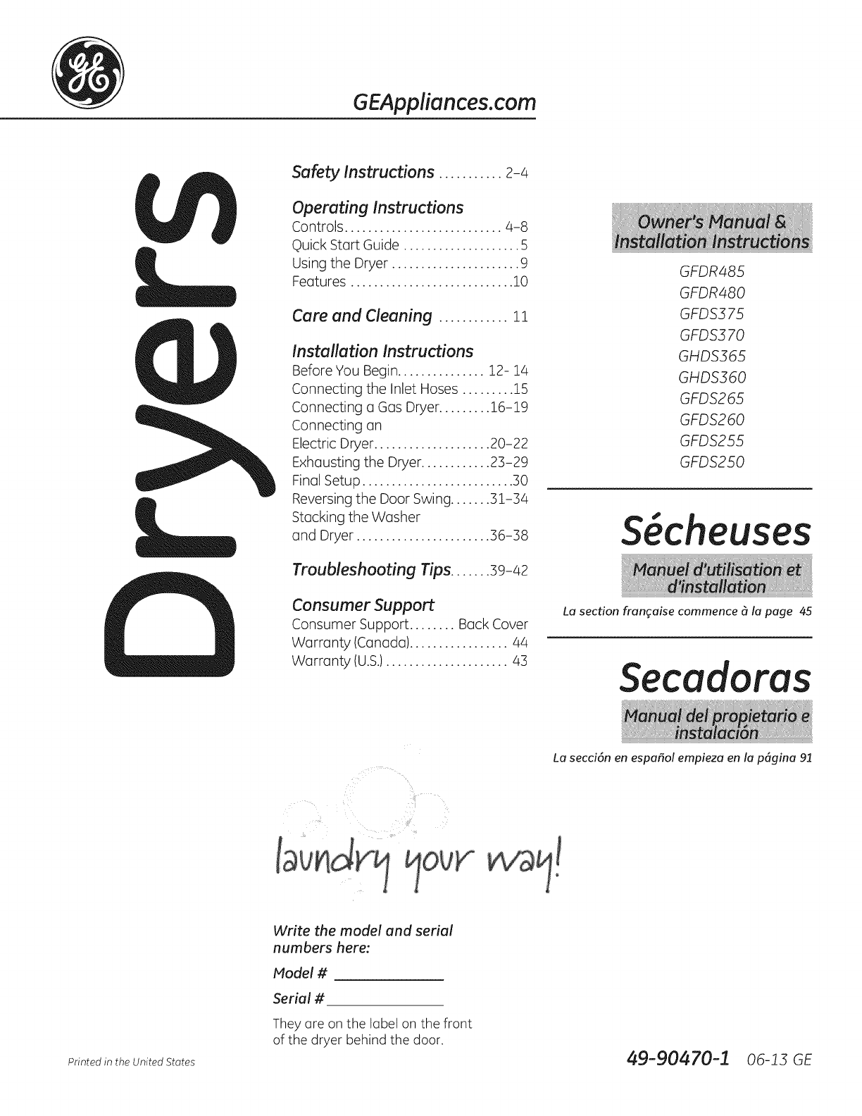 User Manual: GE GFDR270EH0WW GFDR270EH0WW GE DRYER - Manuals and Guides View the owners manual for your GE DRYER #GFDR270EH0WW. Home:Laundry & Garment Care Parts:GE Parts:GE DRYER Manual