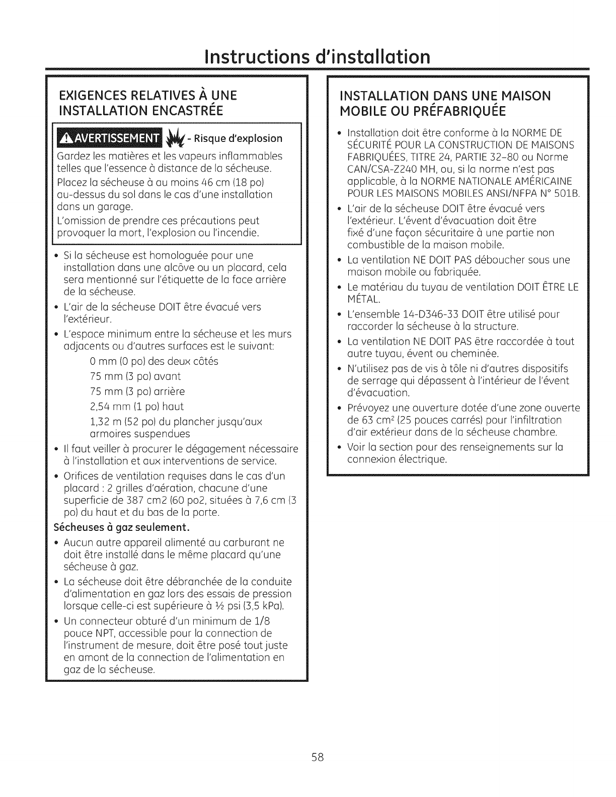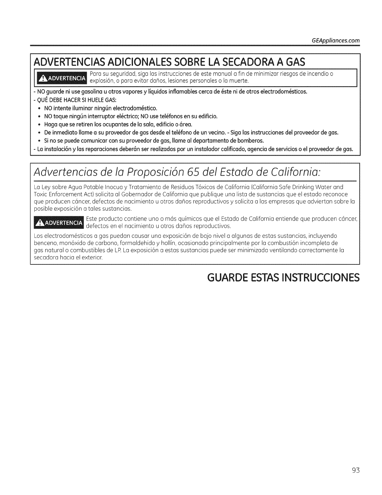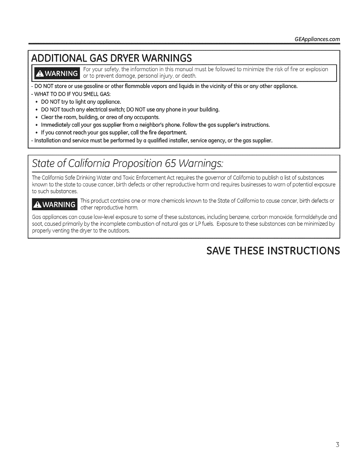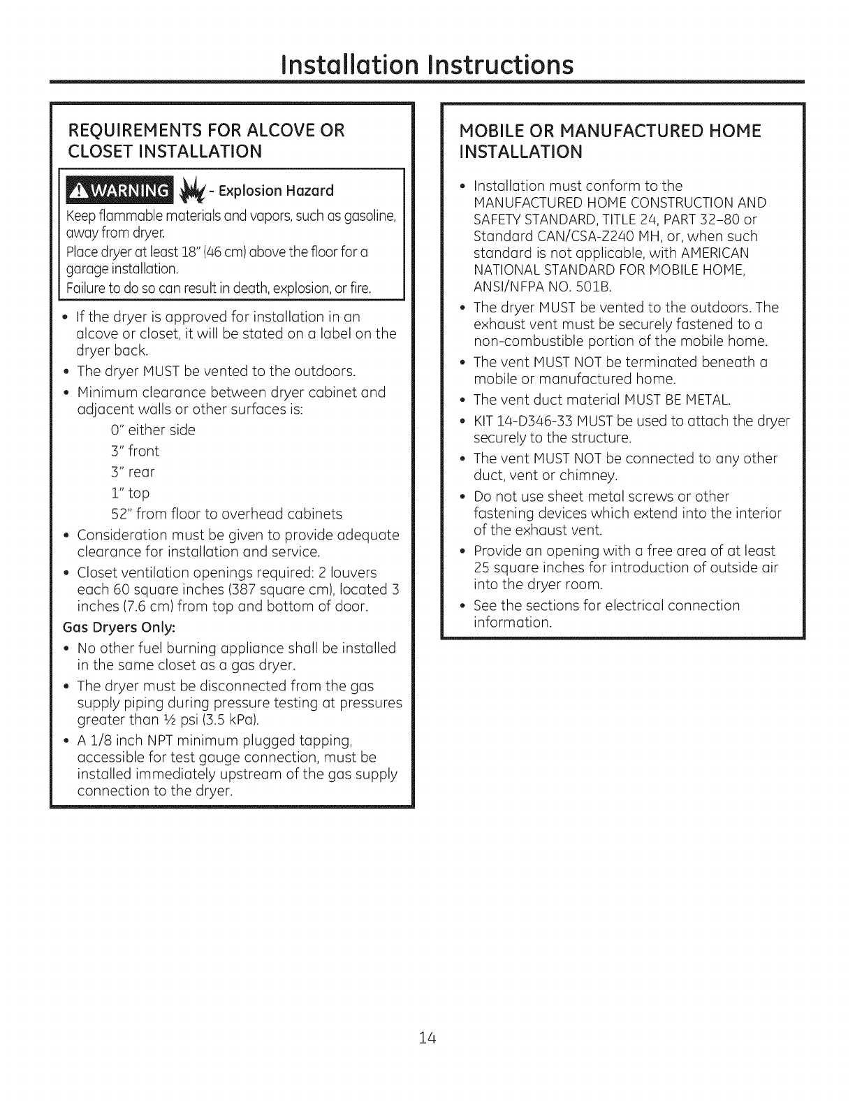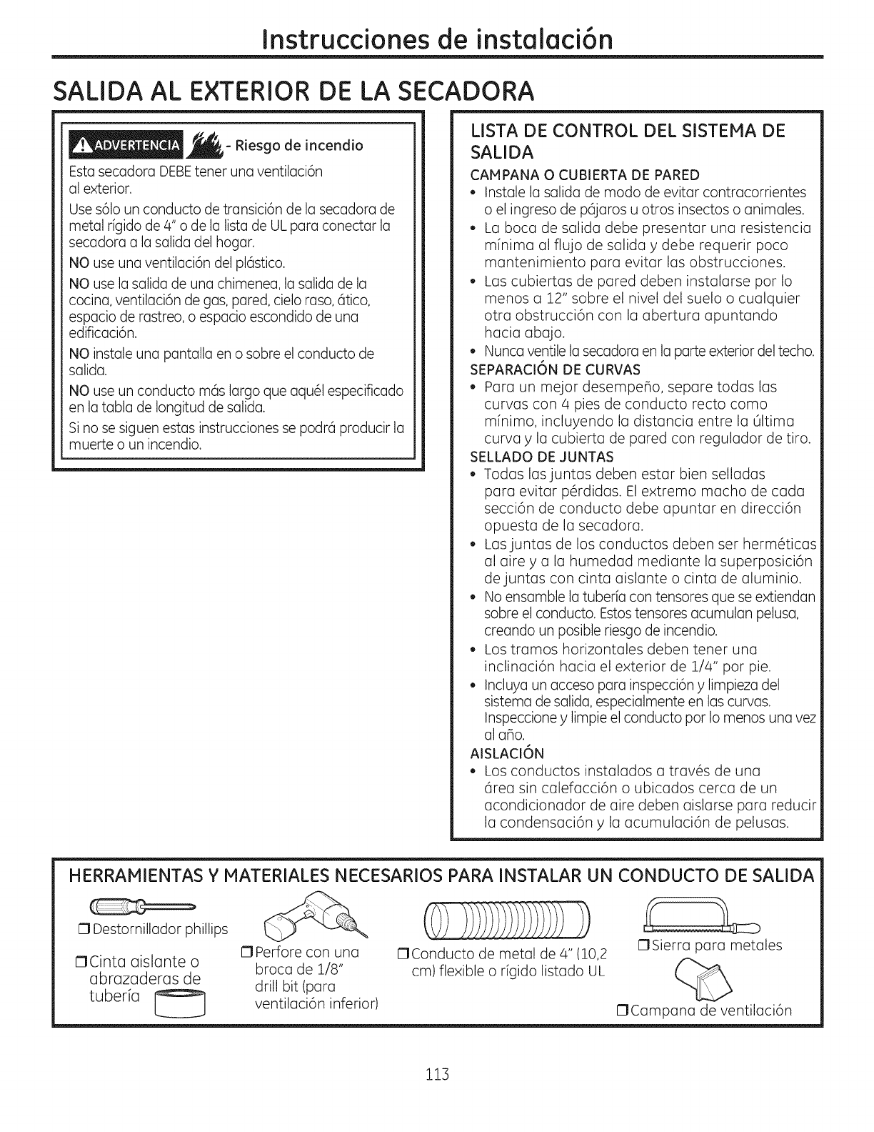 [] Do not store combustible materials, gasoline or other flammable liquids near the dryer. Keep area around the exhaust