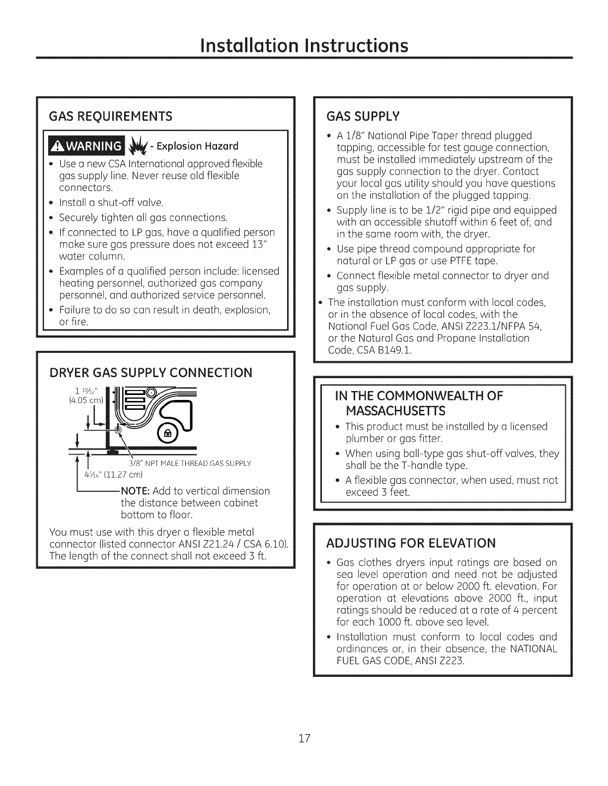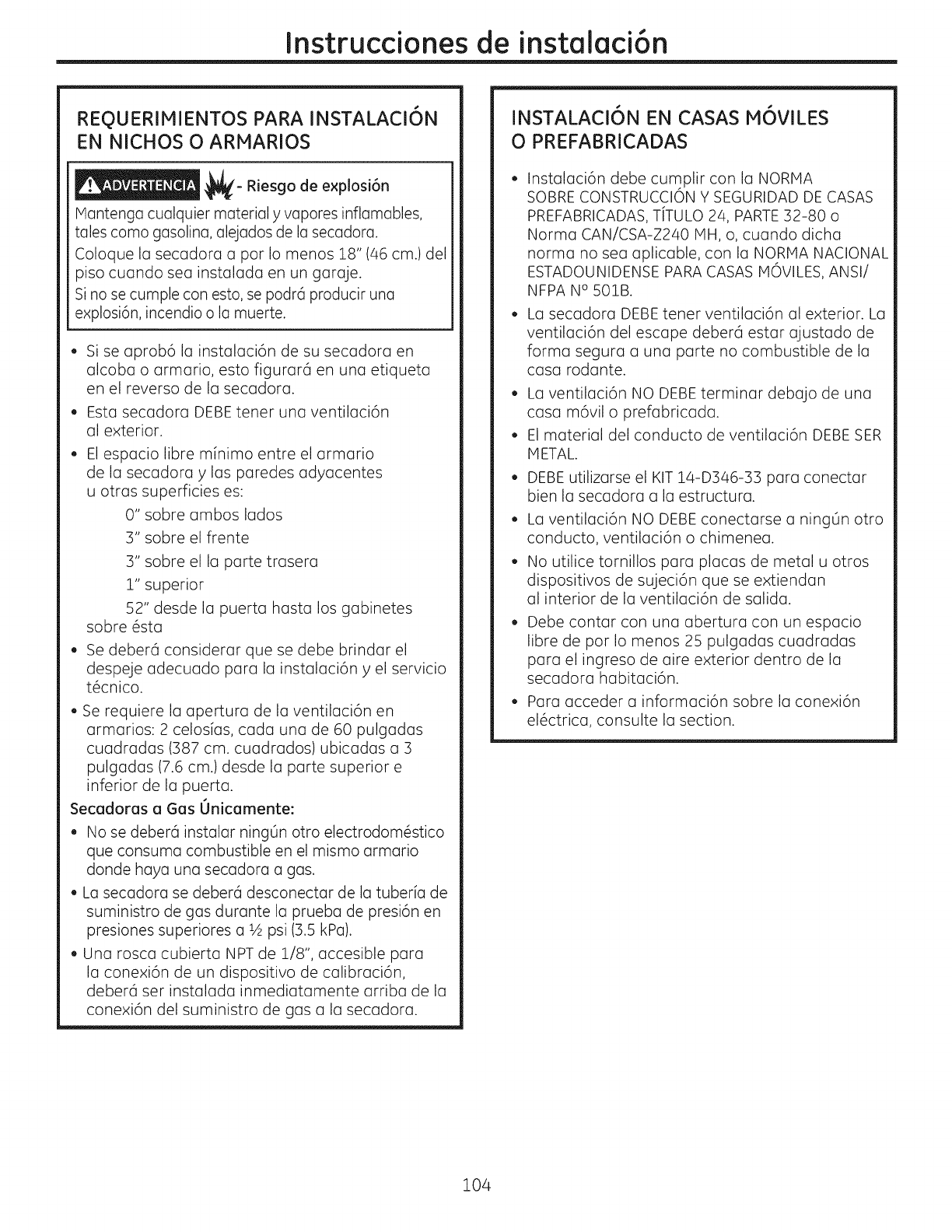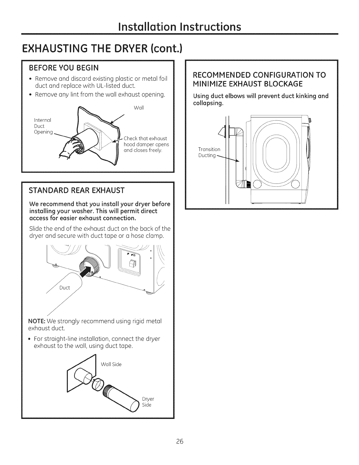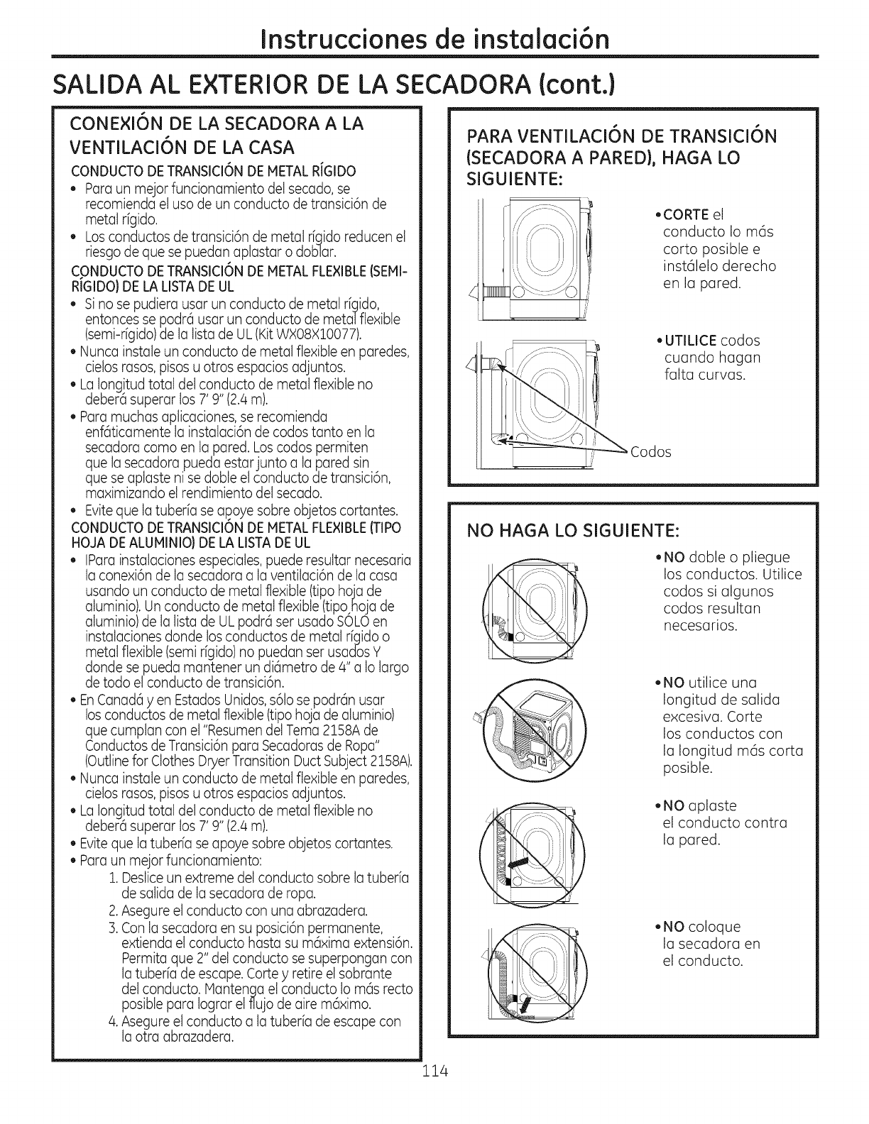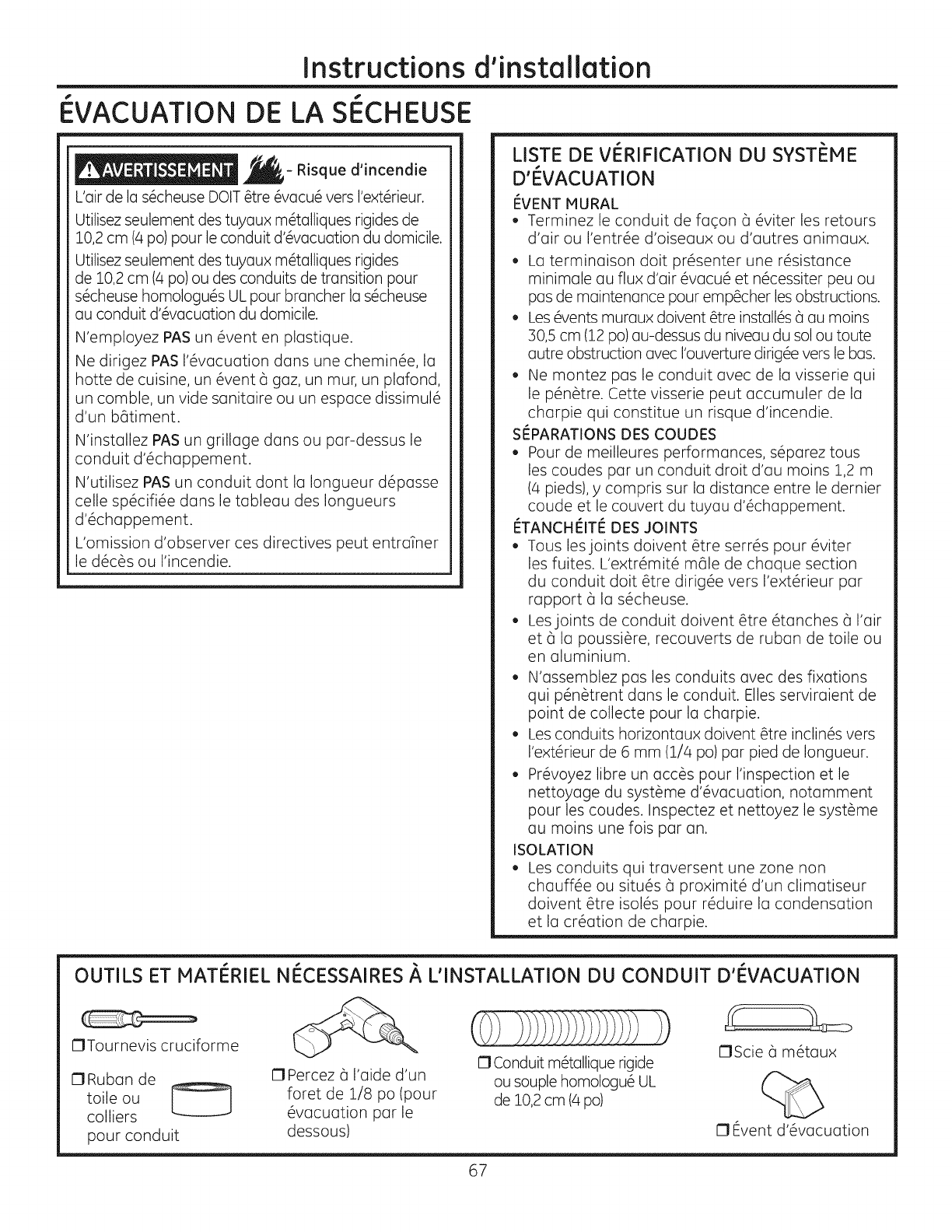 [] Do not store combustible materials, gasoline or other flammable liquids near the dryer. Keep area around the exhaust