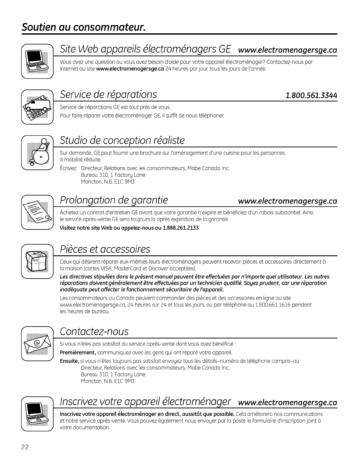Internet au site www.electromenagersge.ca 2/4heures parjour, tous lesjours de I'ann@e.