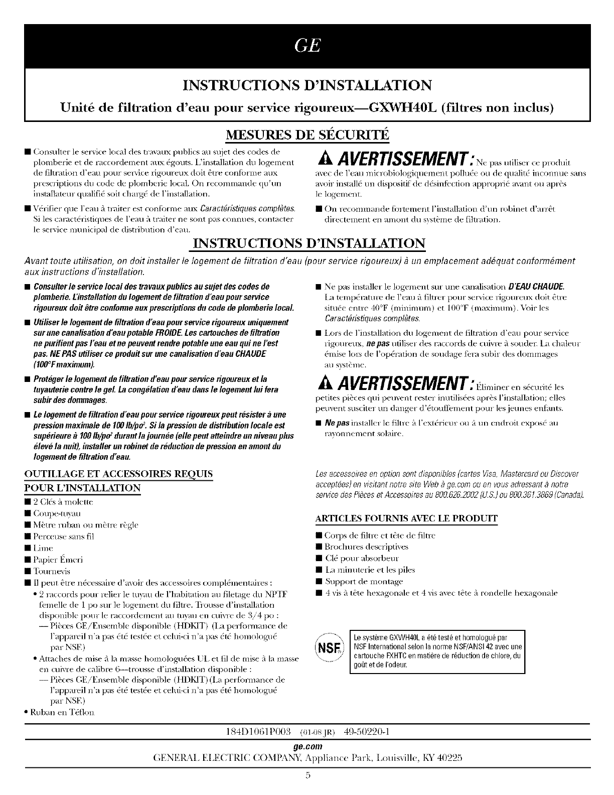GE GXWH40L User Manual WATER SYSTEMS Manuals And Guides L08A6041