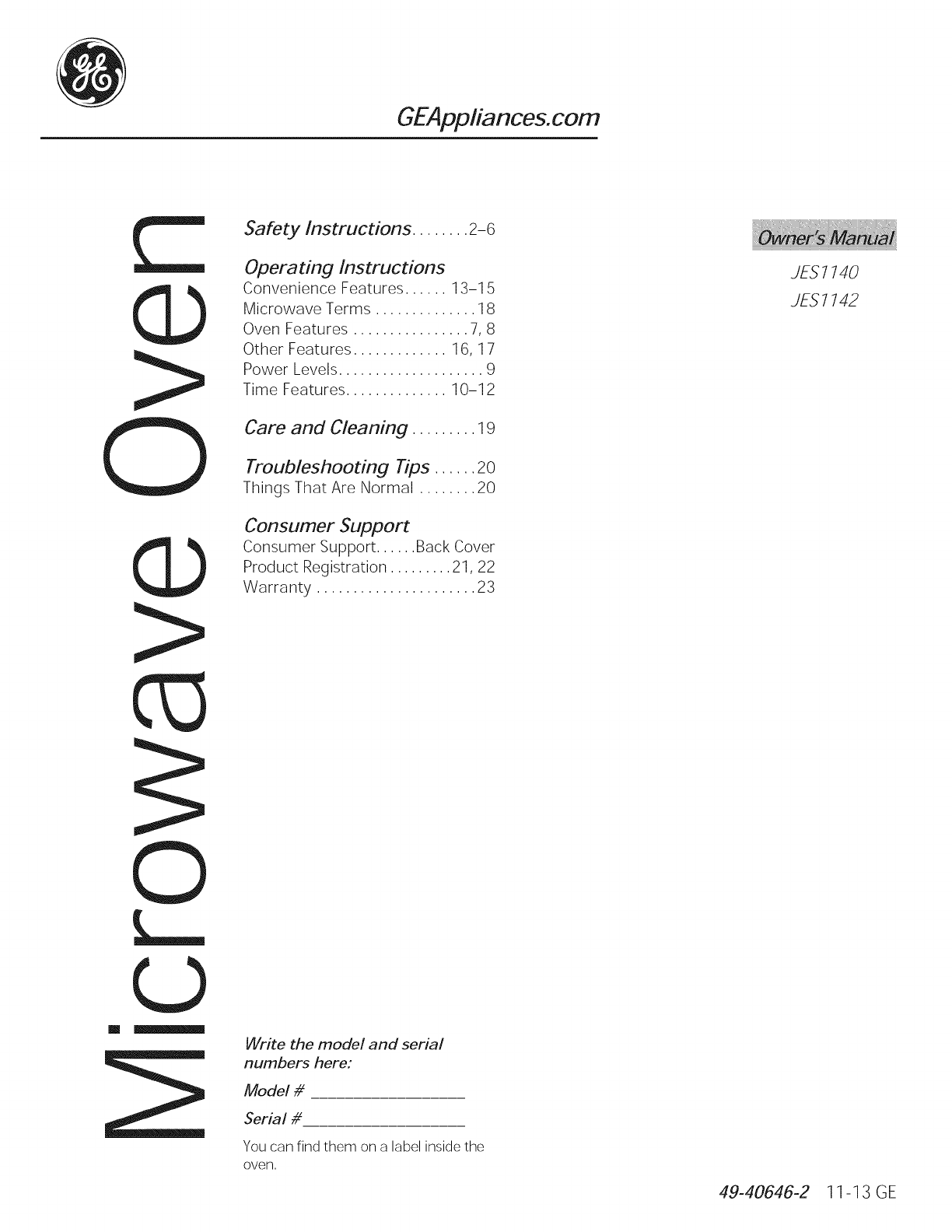 User Manual: GE JES1142SP2SS JES1142SP2SS GE MICROWAVE - Manuals and Guides View the owners manual for your GE MICROWAVE #JES1142SP2SS. Home:Kitchen Appliance Parts:GE Parts:GE MICROWAVE Manual