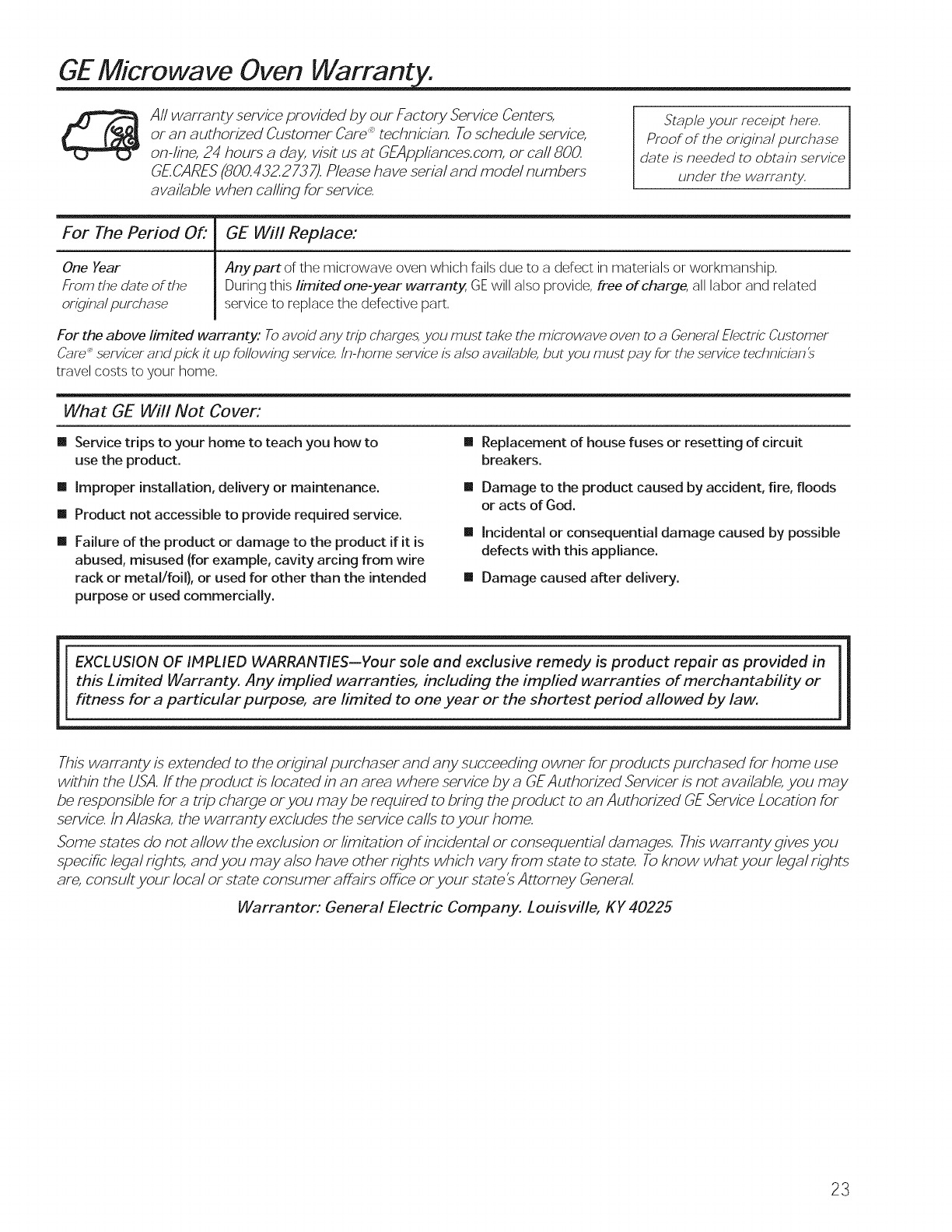 For the above limited warranty: To avoid any trip charges, you must take the microwave oven to aGenera/Electric Customer