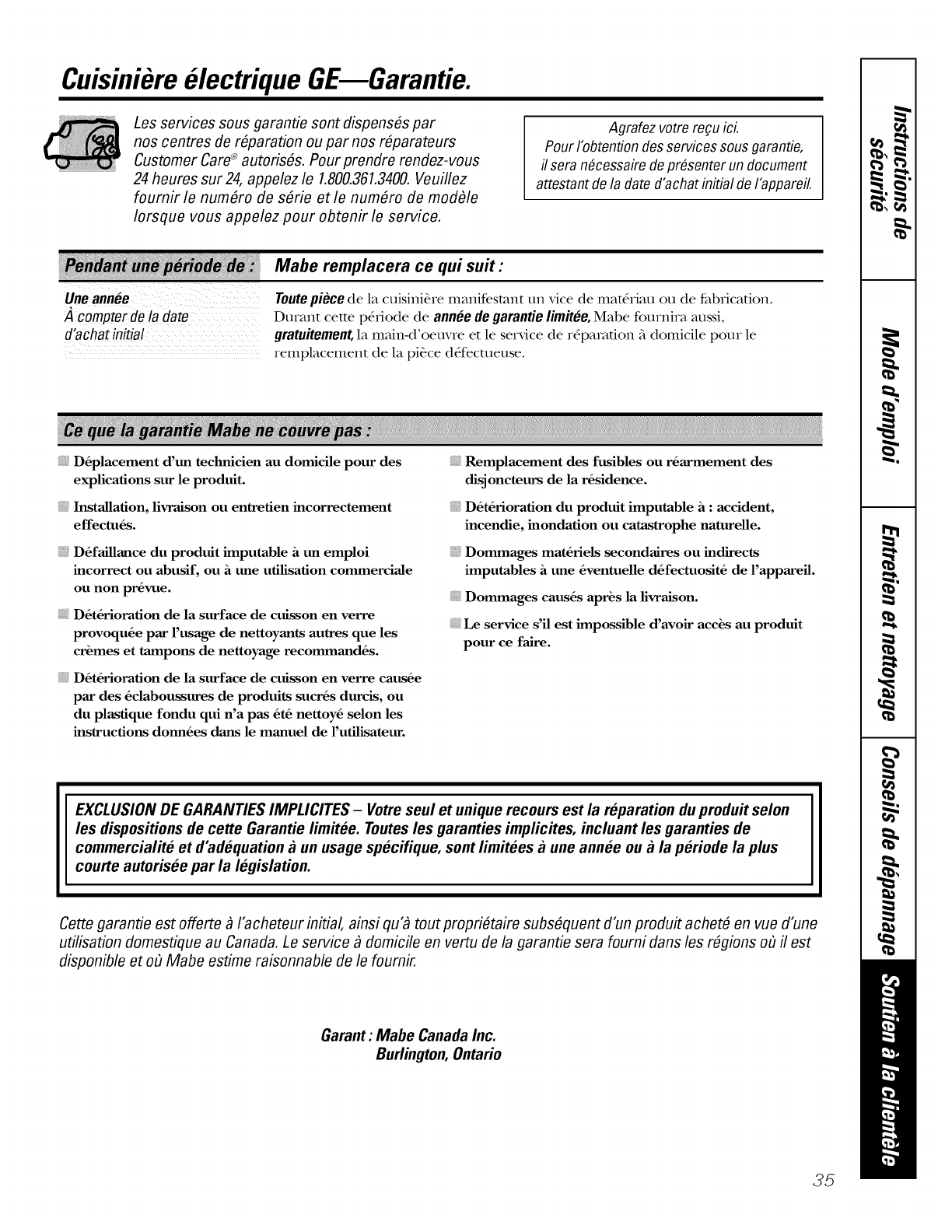 Durant cette p_fiode de annee de garantie limitee, Mabe fournira aussi,