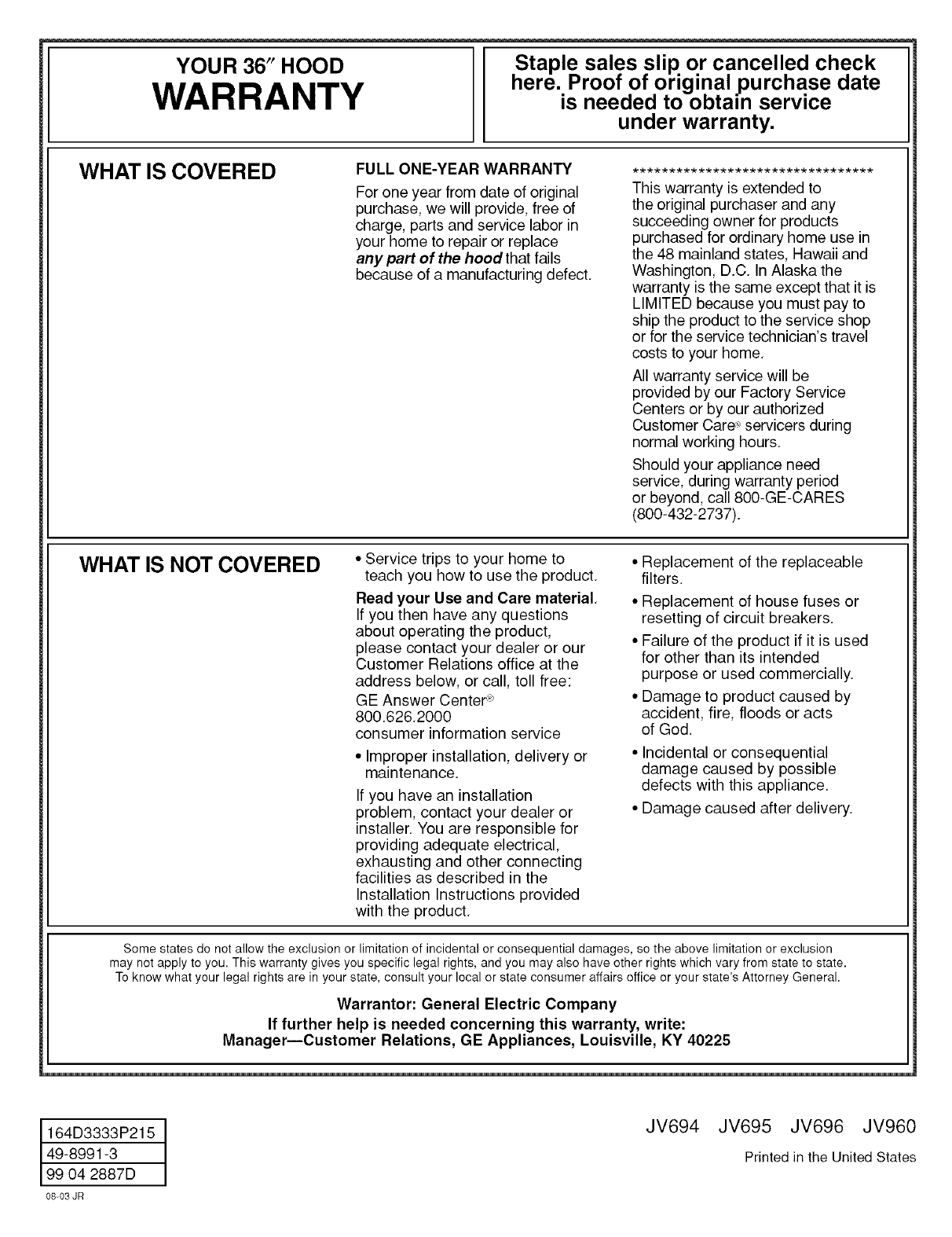 GE JV695SWW User Manual RANGE HOOD Manuals And Guides L0406350