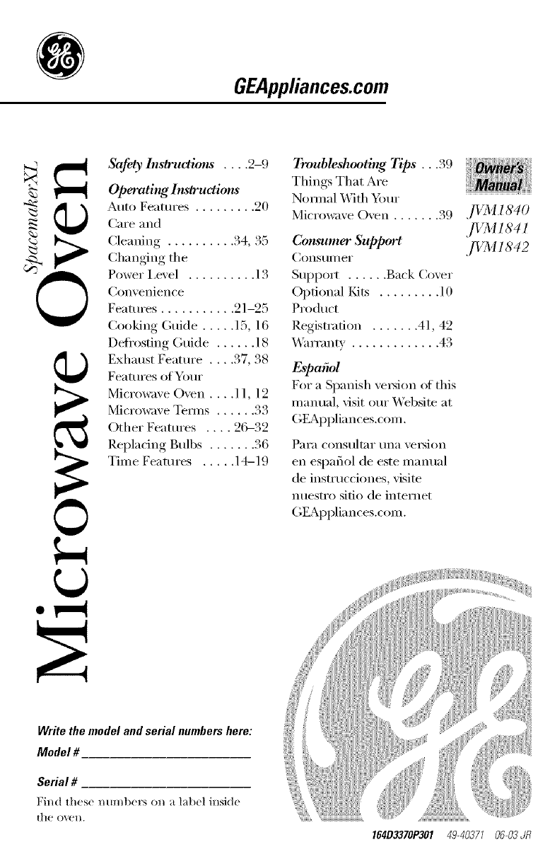 User Manual: GE JVM1842BF001 JVM1842BF001 GE MICROWAVE - Manuals and Guides View the owners manual for your GE MICROWAVE #JVM1842BF001. Home:Kitchen Appliance Parts:GE Parts:GE MICROWAVE Manual