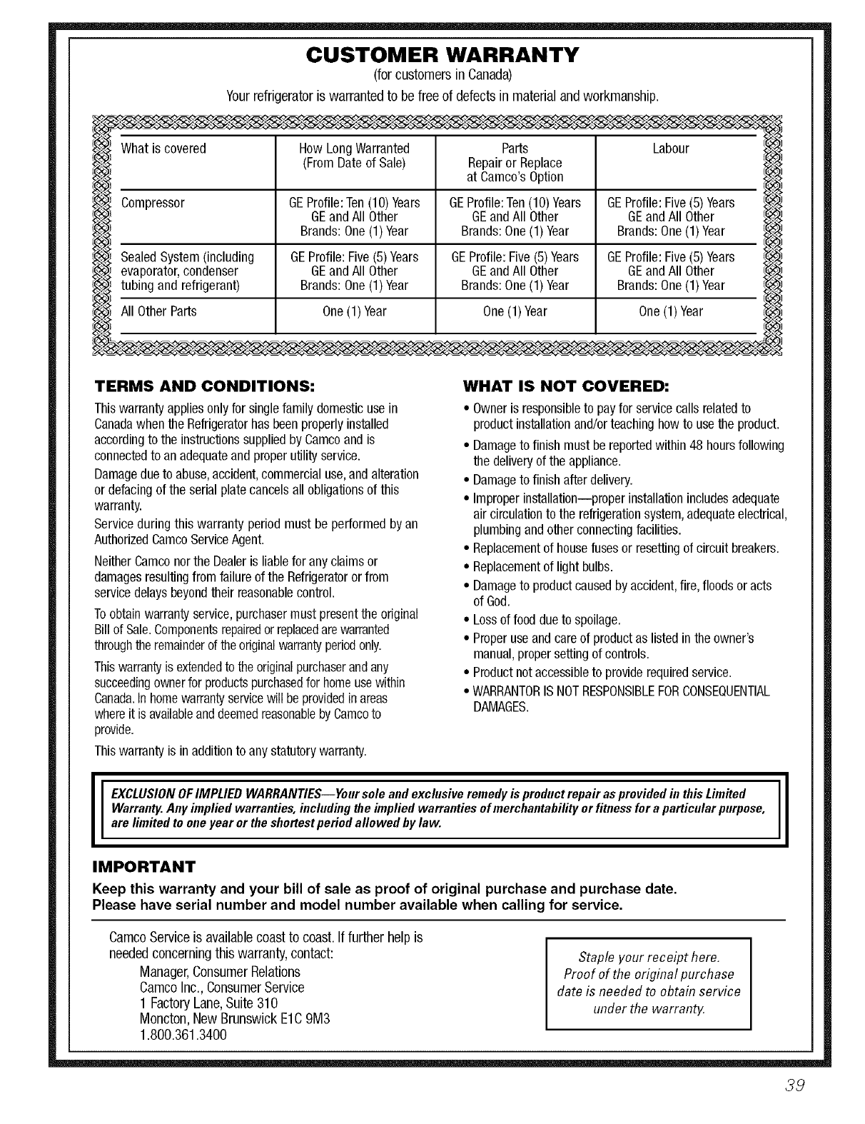 In Canada, contact: Managei; Consmner Relations, Camco, Inc.