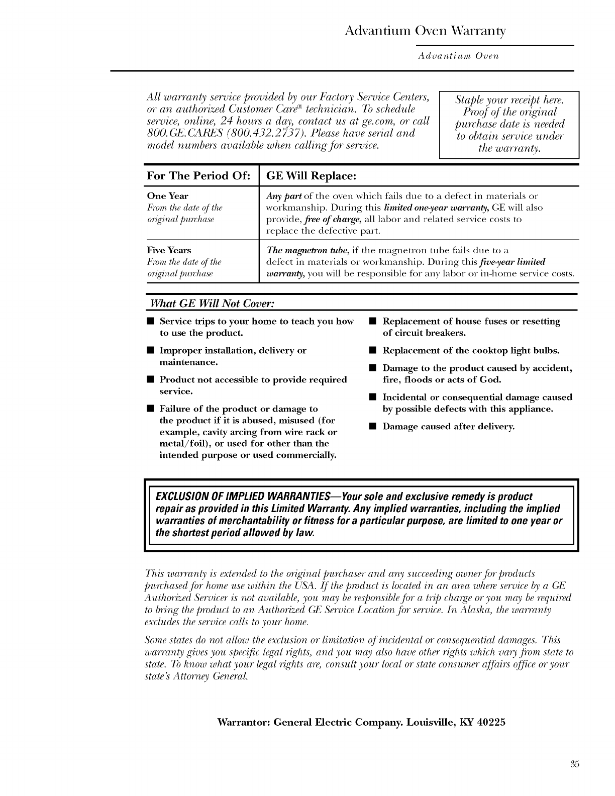 purchased for home use within the USA. If the product is located in an area where service by a GE