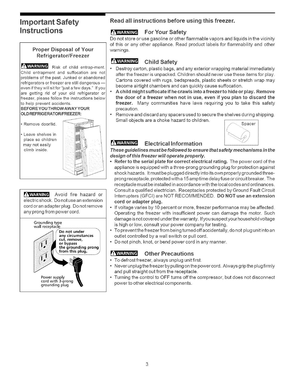 • A child might suffocate if he crawms into a freezer to hide or play. Remove
