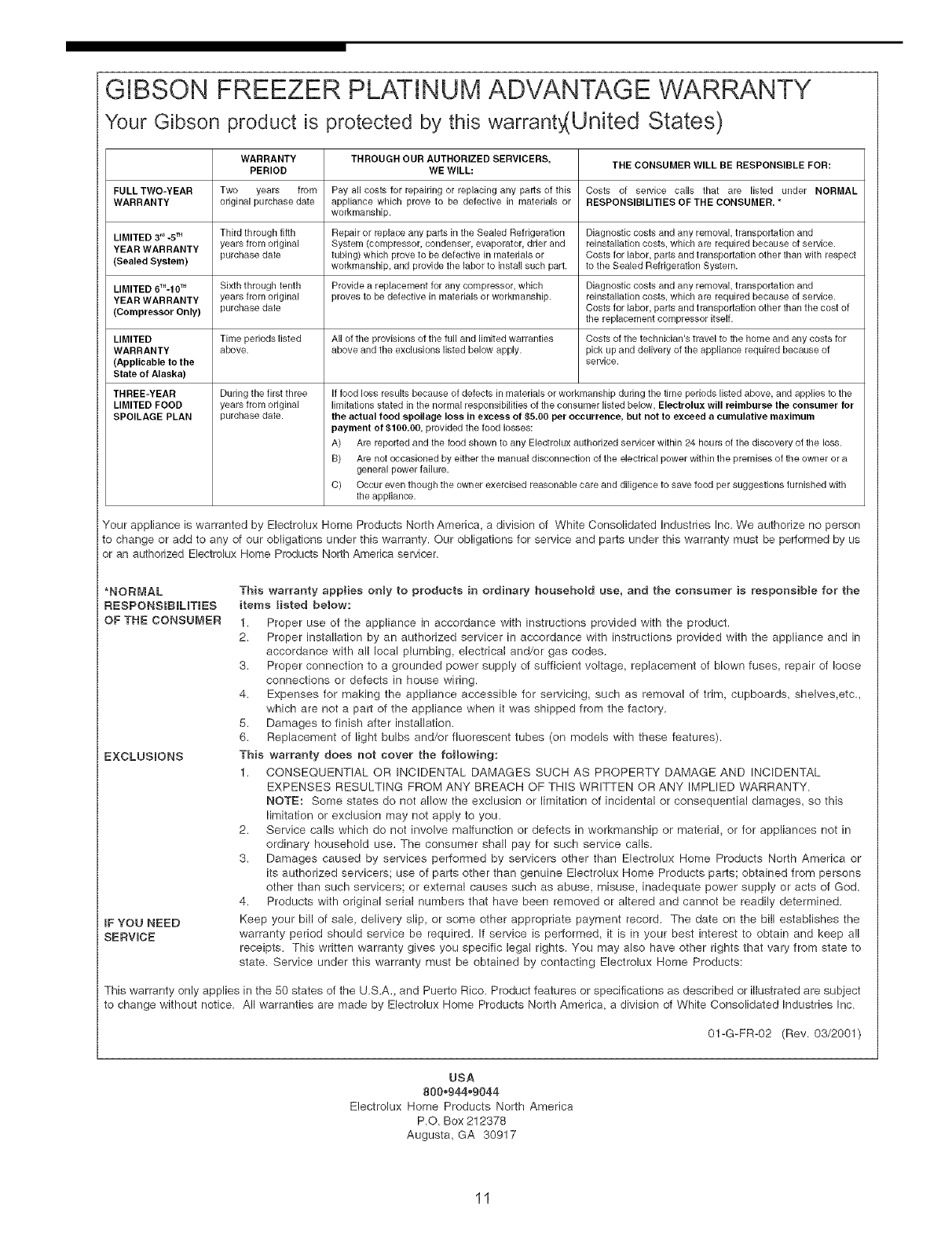 3= Damages caused by services performed by servicers other than Electrolux Home Products North America or