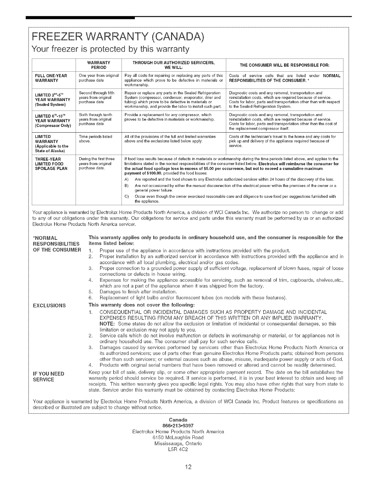 FREEZER WARRANTY (CANADA)