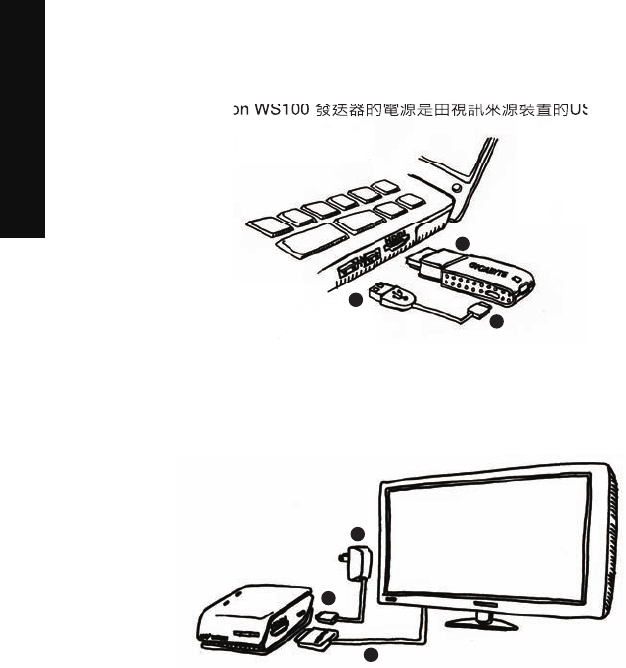WS100 전송기의 전원은 소스 장비의 USB 포트를 통해 공급됩니다.