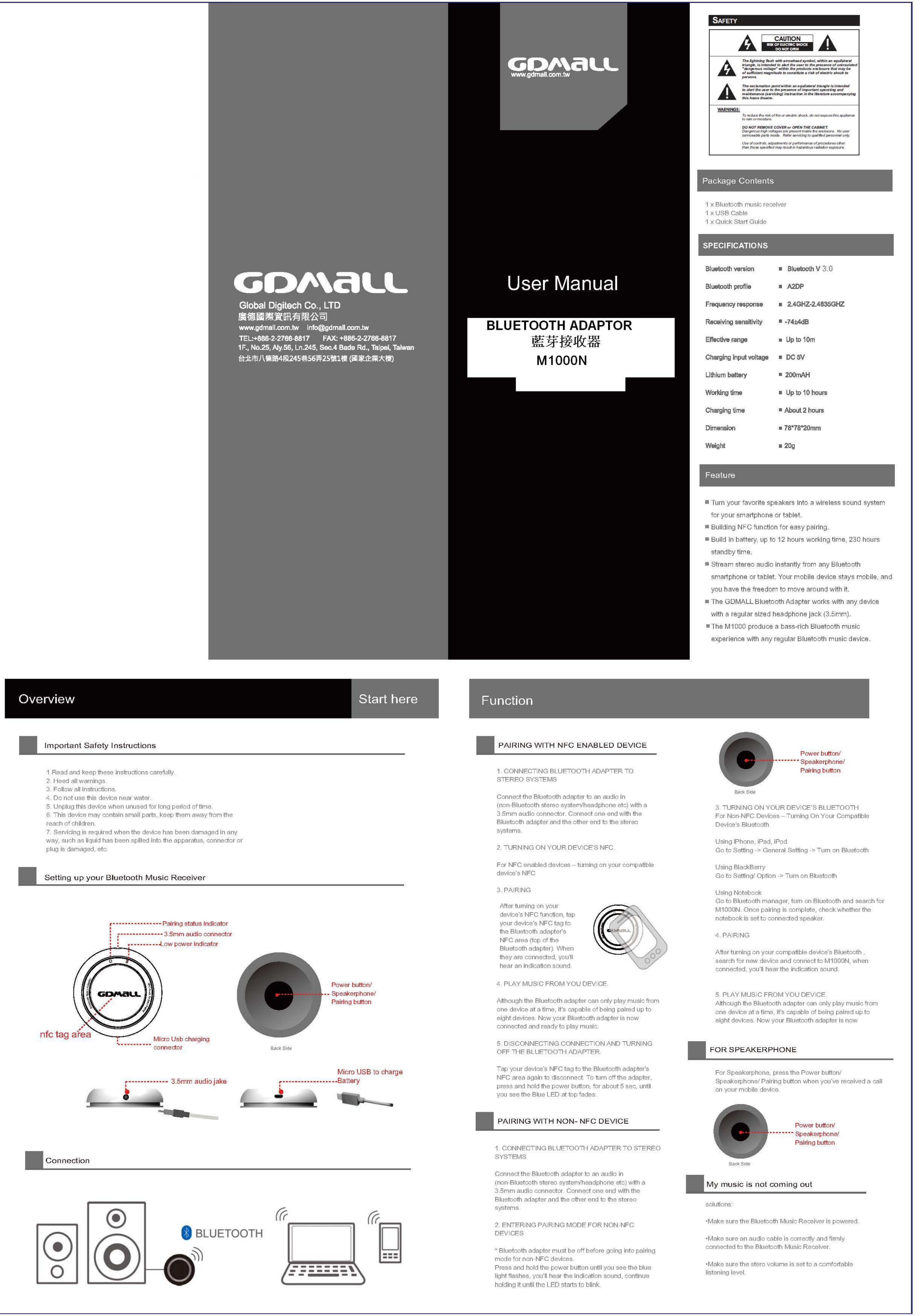 GLOBAL DIGITECH CO GDMALLM1000N Bluetooth Adaptor User Manual