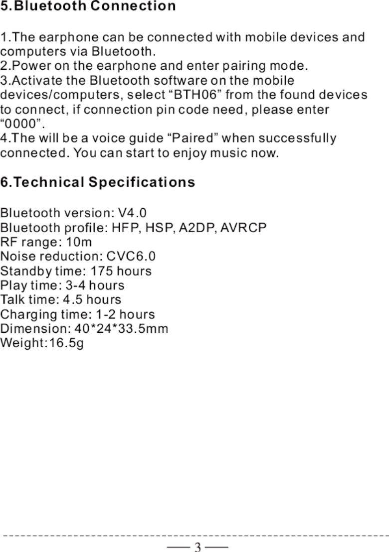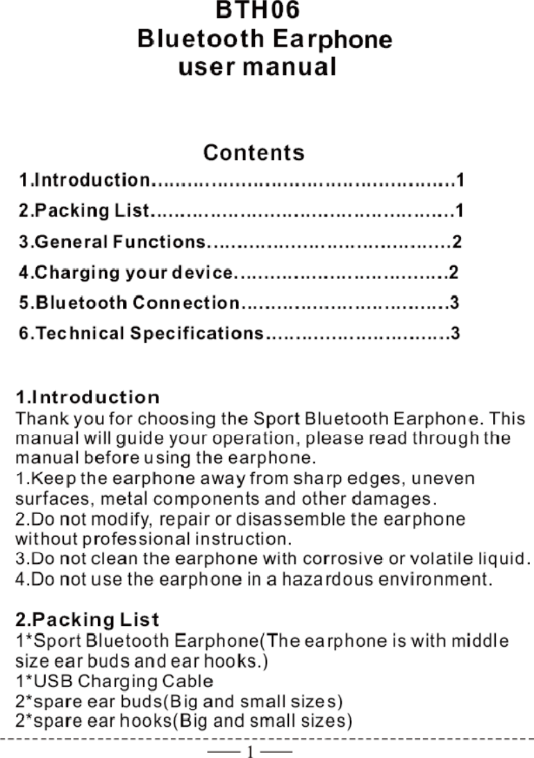GOLD FINGERS TECHNOLOGY BTH06 Bluetooth Earphone User Manual Manual