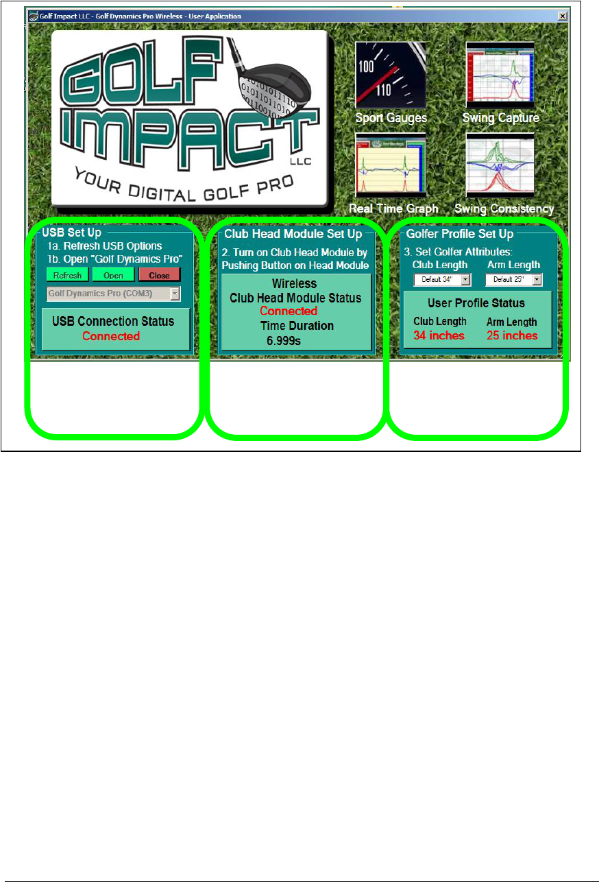 Up” block of the “Golf Dynamics Pro Main Application” window the status of the