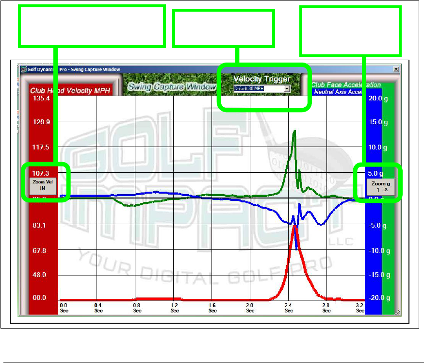 The swing capture also has separate zoom controls for the velocity measurement (the scale on the