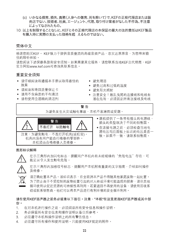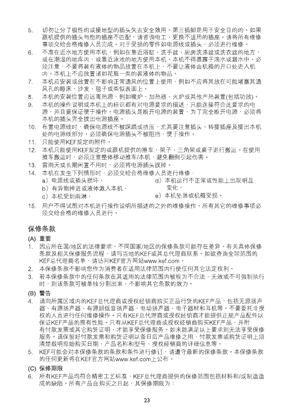 15.修理について。お客さまご自身での修理はしないでください。全ての修理はKEF製品を修理