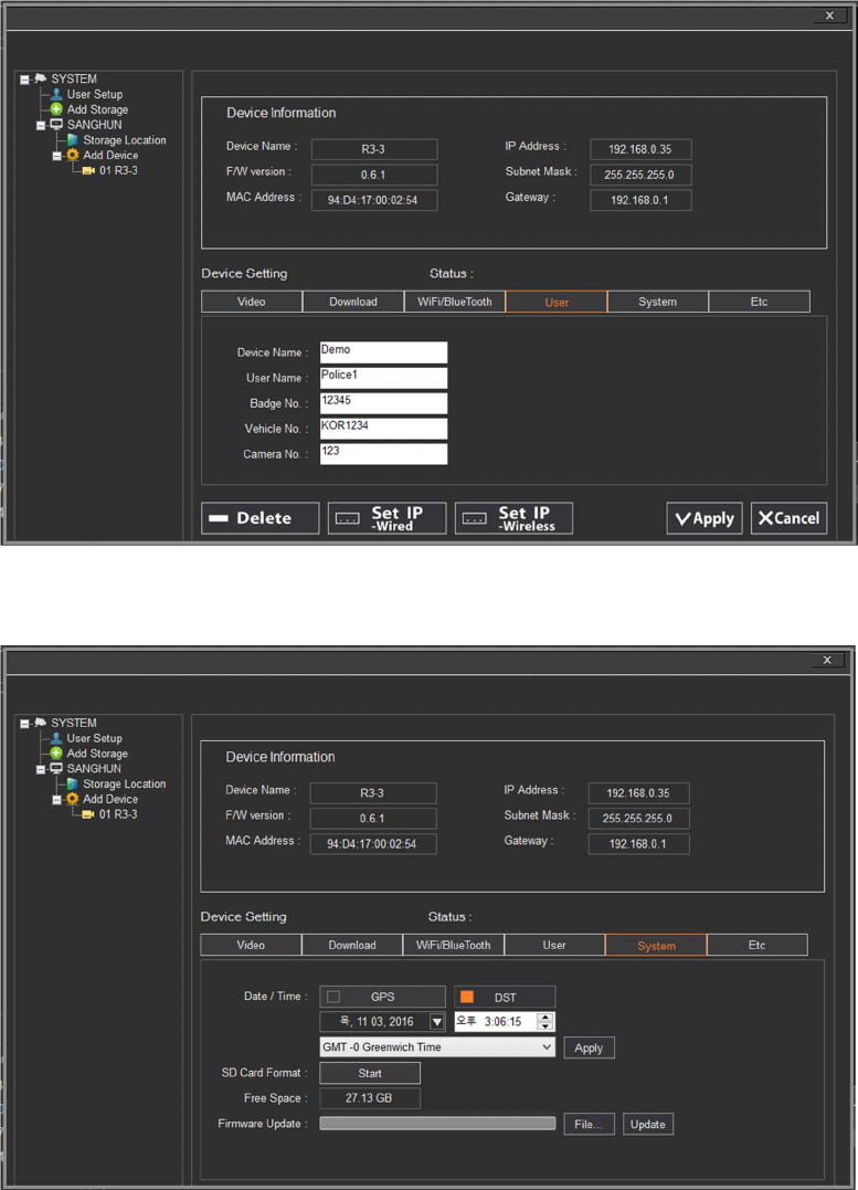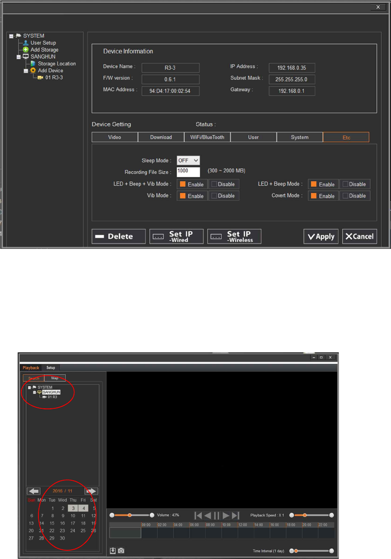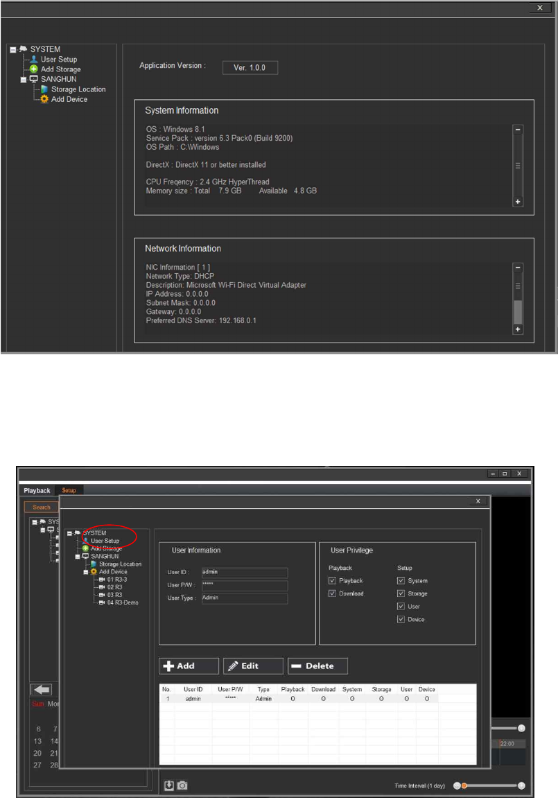 (Adding or deleting users, setting privileges for Playback, Download, System, Storage and Device).