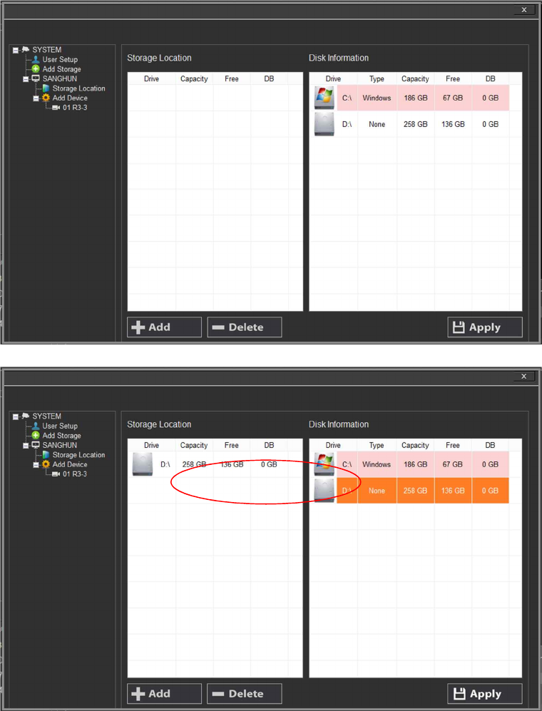 3. Storage location: set the storage location from the Disk information side and then click "add" button.