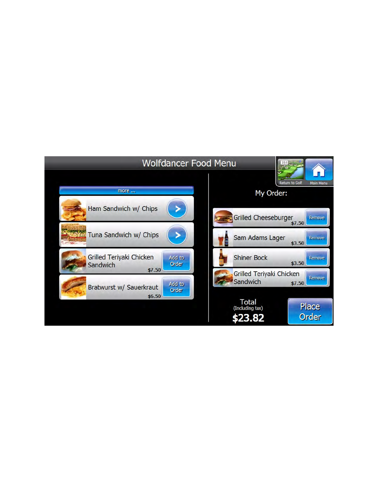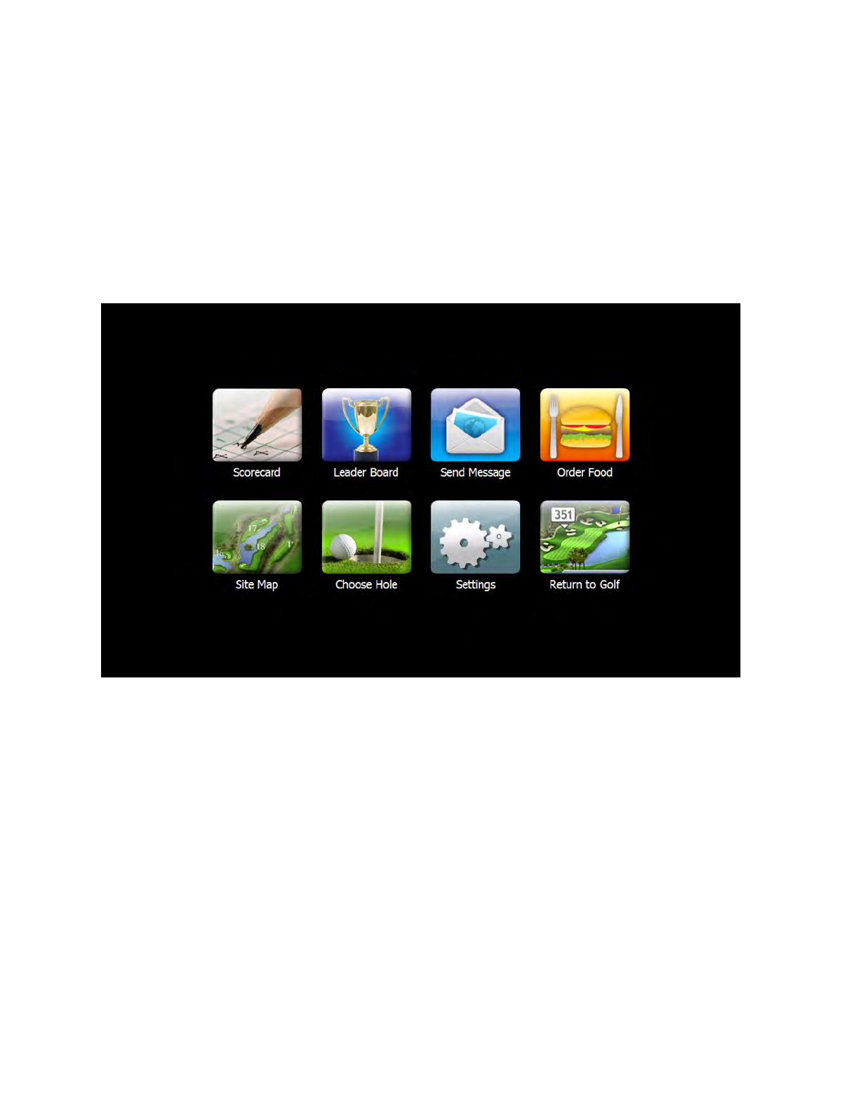 The Visage Main Menu allows you access to features such as food ordering, scorecards and leaderboards, and