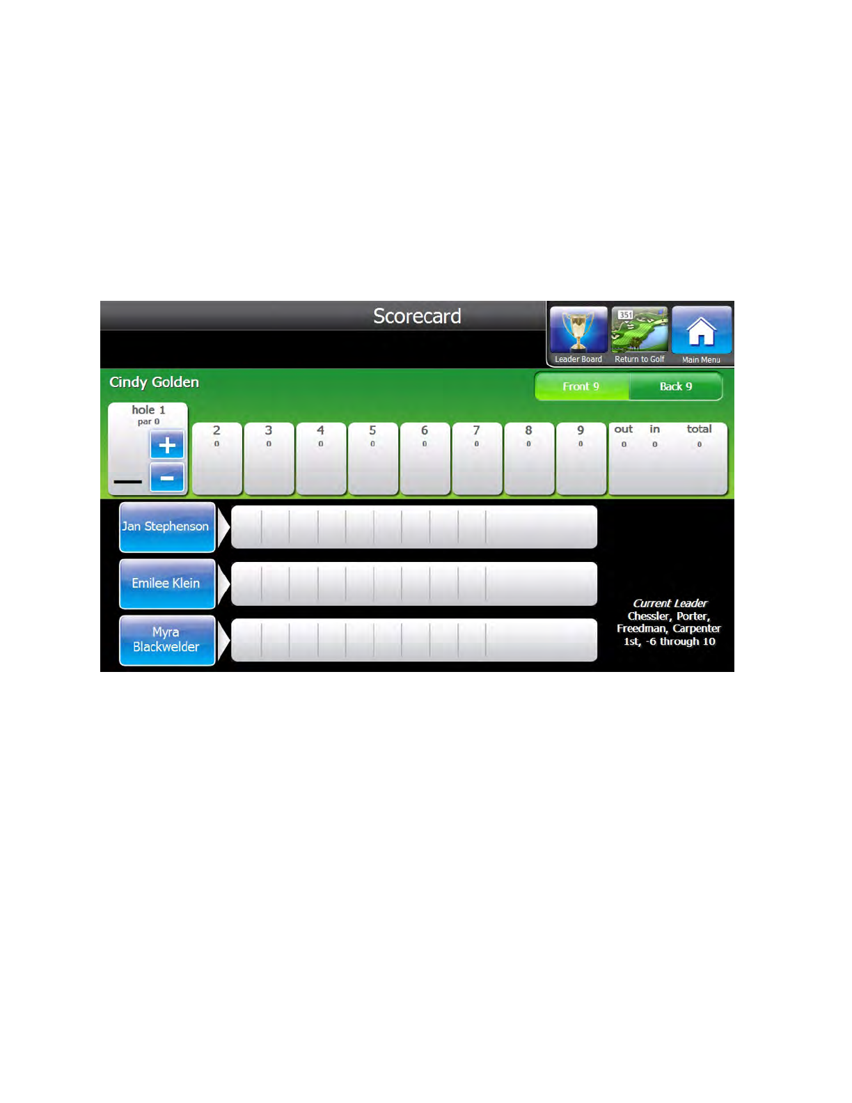 The Visage scorecard allows you to enter scores for up to four players. After you have finished playing a hole (by driving