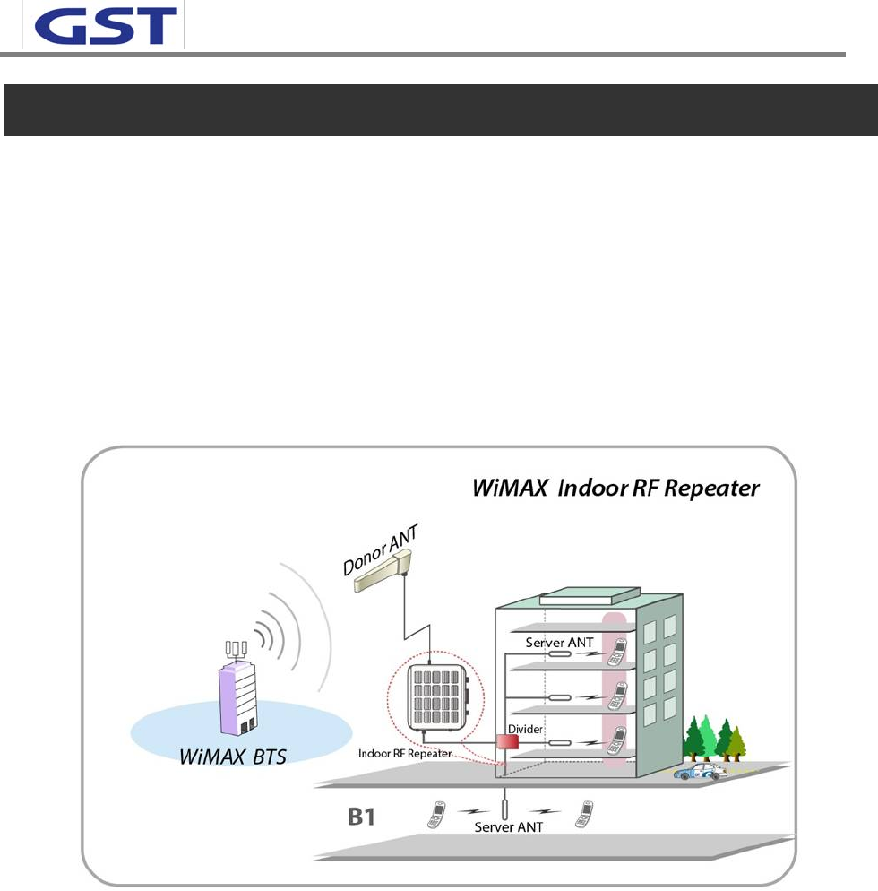 Below picture shows a Network structure for WIMAX Indoor RF Repeater in a real site. Donor ANT