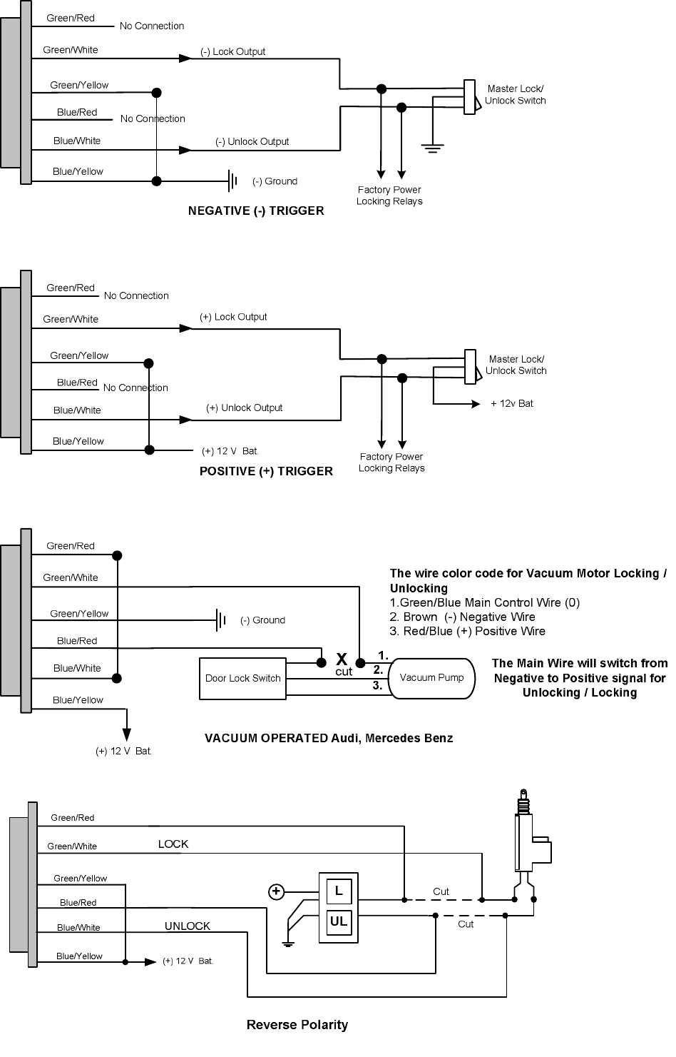 Negative trigger door lock systems send a Negative (Ground) pulse to existing factory relays to lock and unlock the vehicle doors.