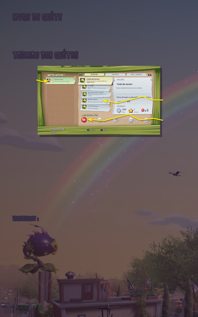 trouverez dans ce menu vos quêtes en cours ainsi que vos pièces, vos étoiles et