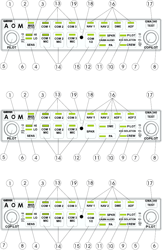 by pressing either COM 1 MIC, COM 2 MIC, or COM 3 MIC (14). The active com audio is always heard
