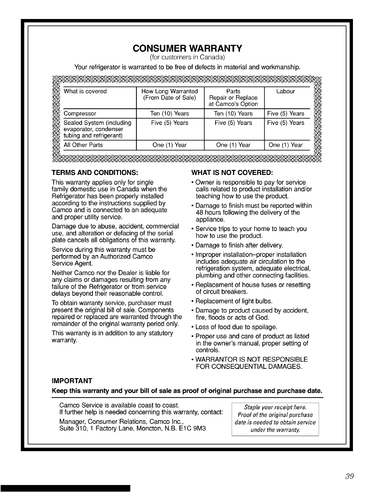 In Canada, contact: Manages; Consumer Relations, Camco, Inc.