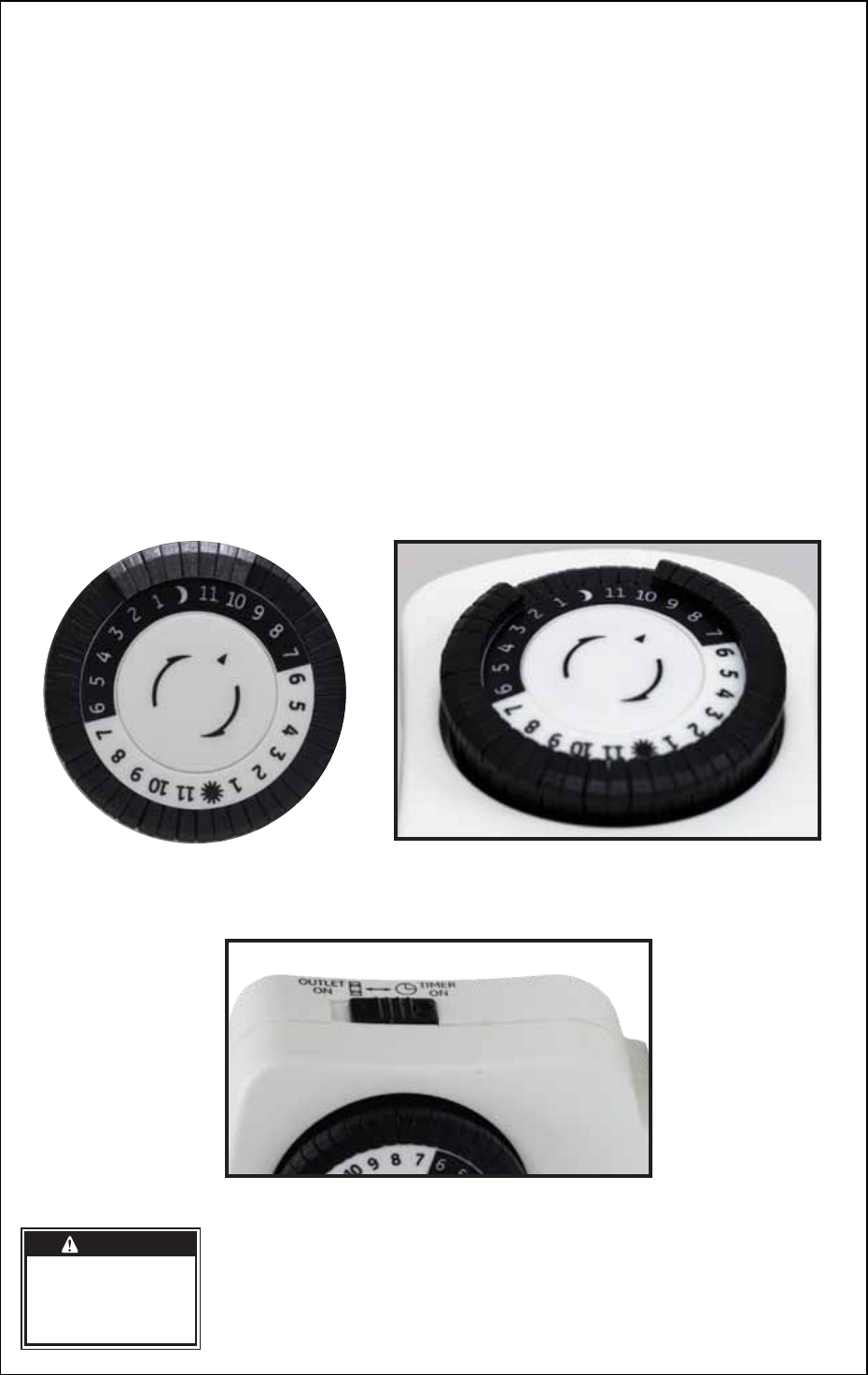 5. Plug the lamp into the outlet on the side of the timer. Turn the lamp’s switch on for automatic control. The timer will not turn