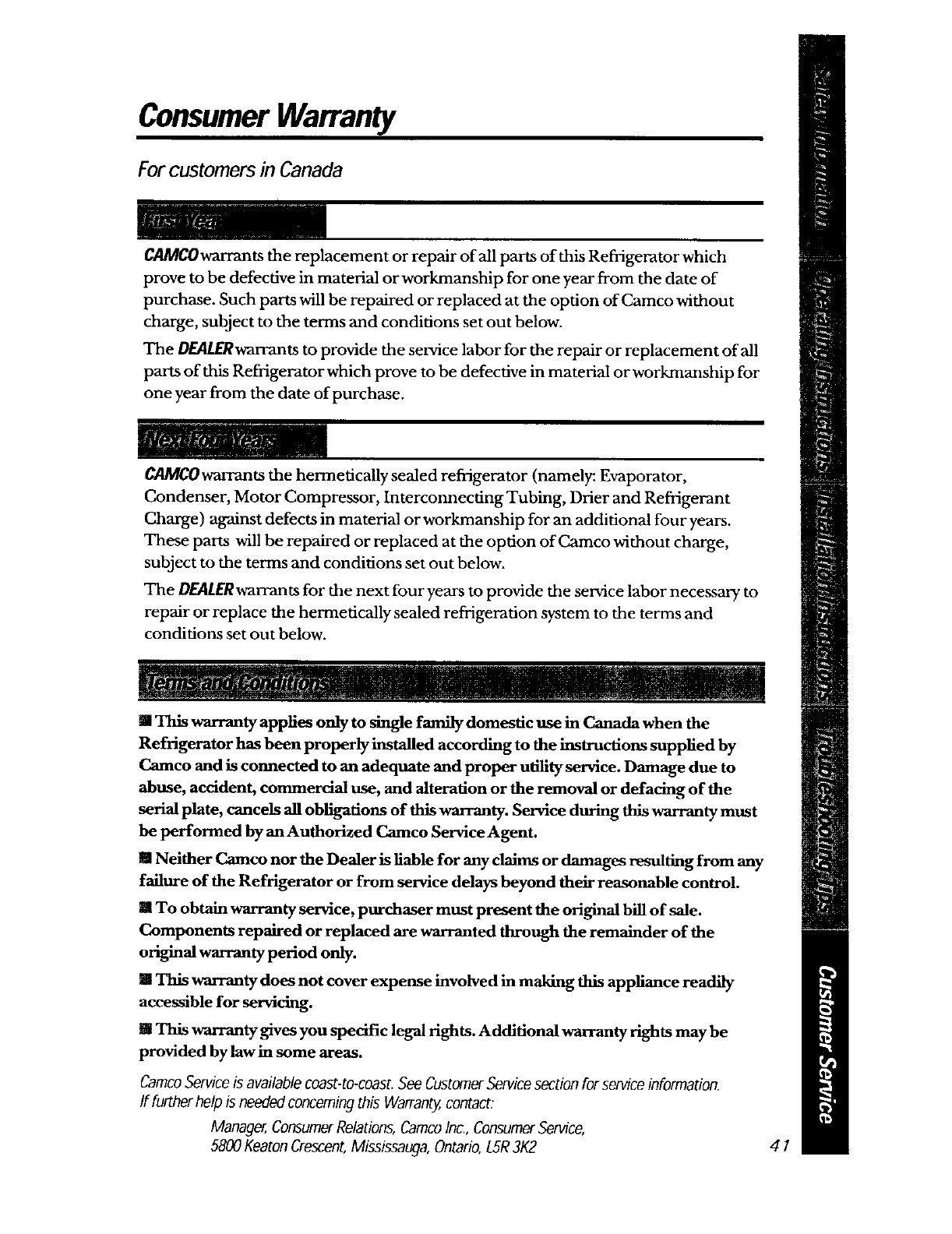 CAMCOwarrants the replacement or repair of all parts of this Refrigerator which