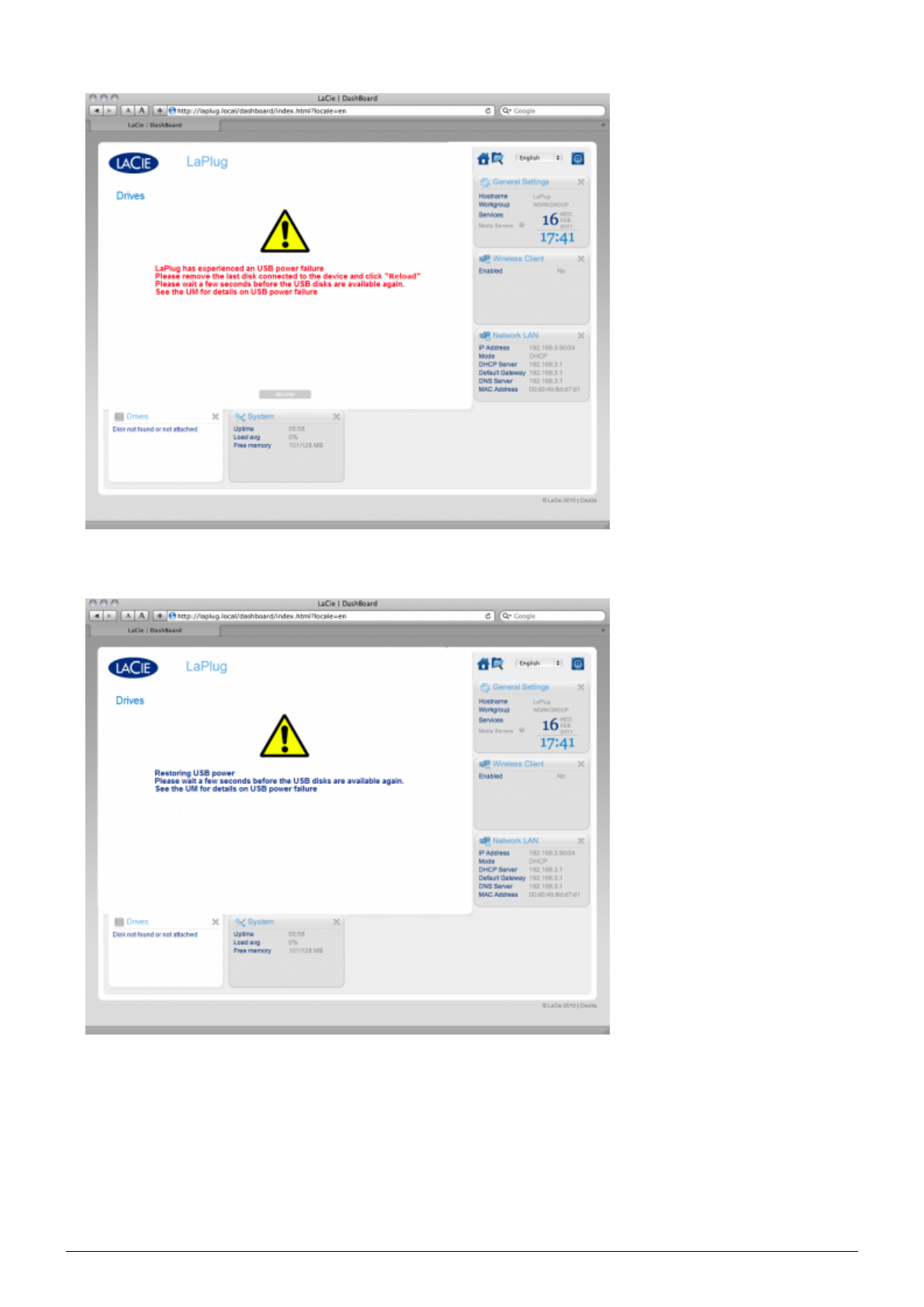 Important info: USB power failure: If you connect hard drive(s) to the LaPlug that experience a USB failure,