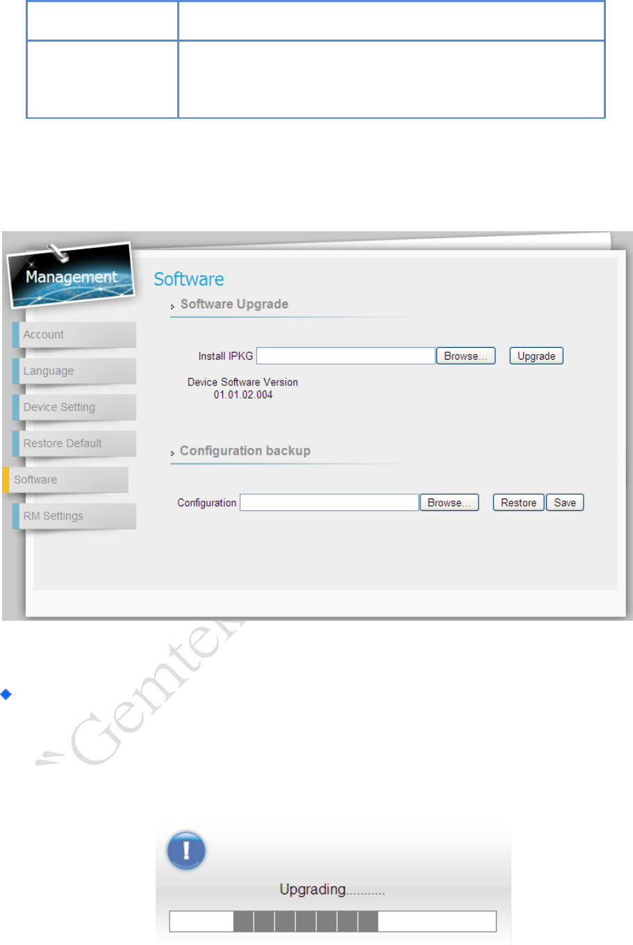 Software Upgrade: Click “Browse” button to select update file, and then click