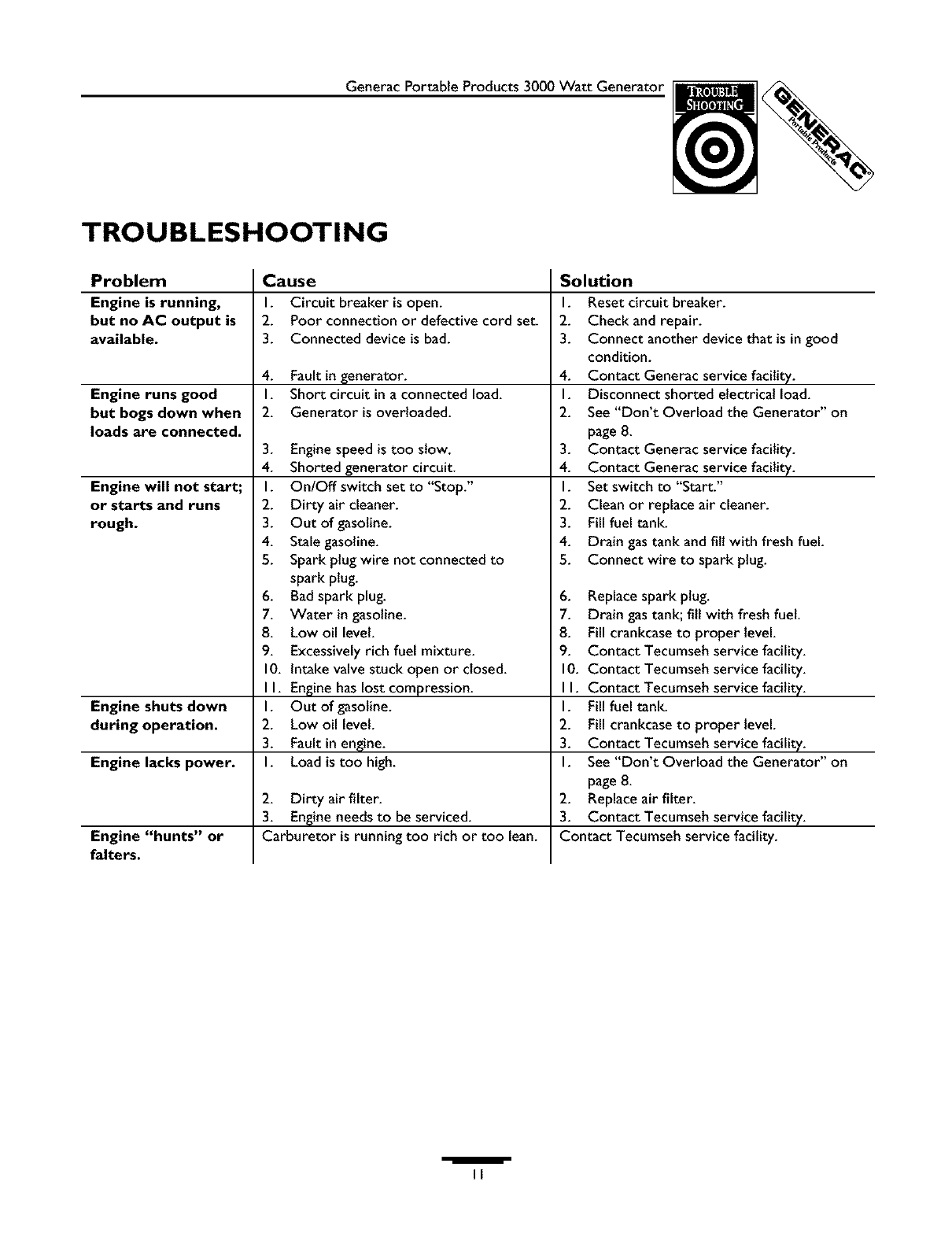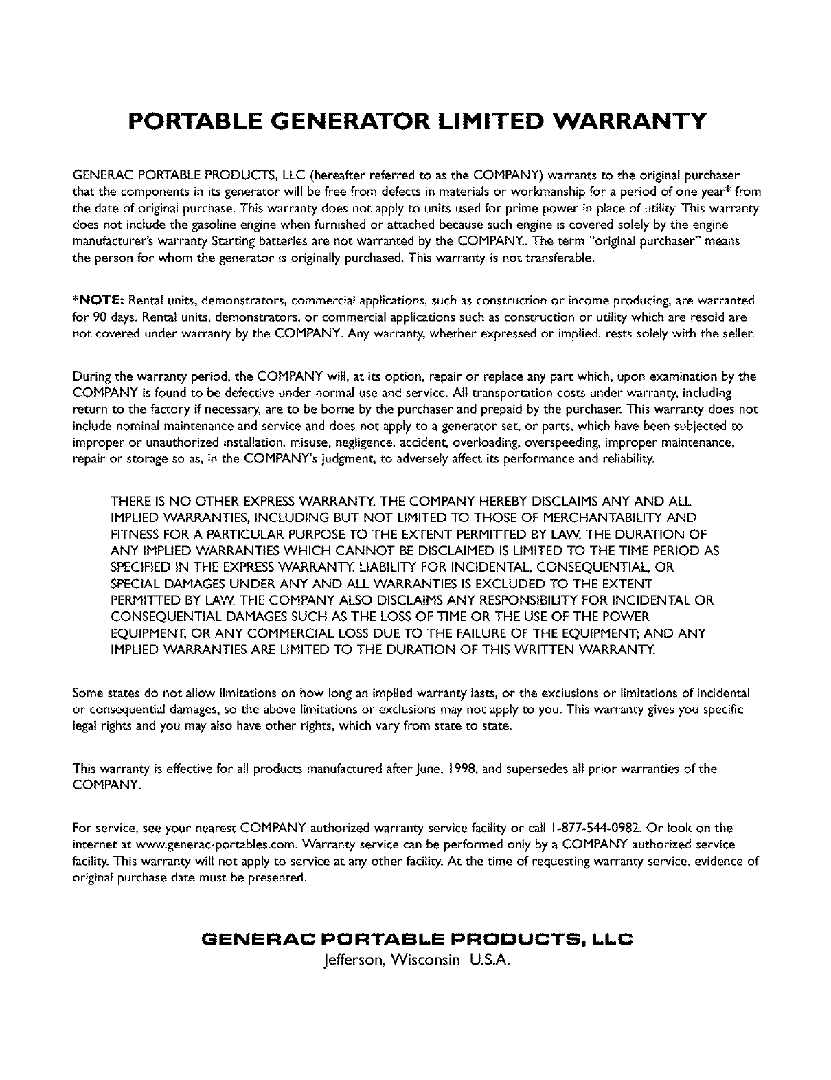 the person for whom the generator is originally purchased. This warranty is not transferable.