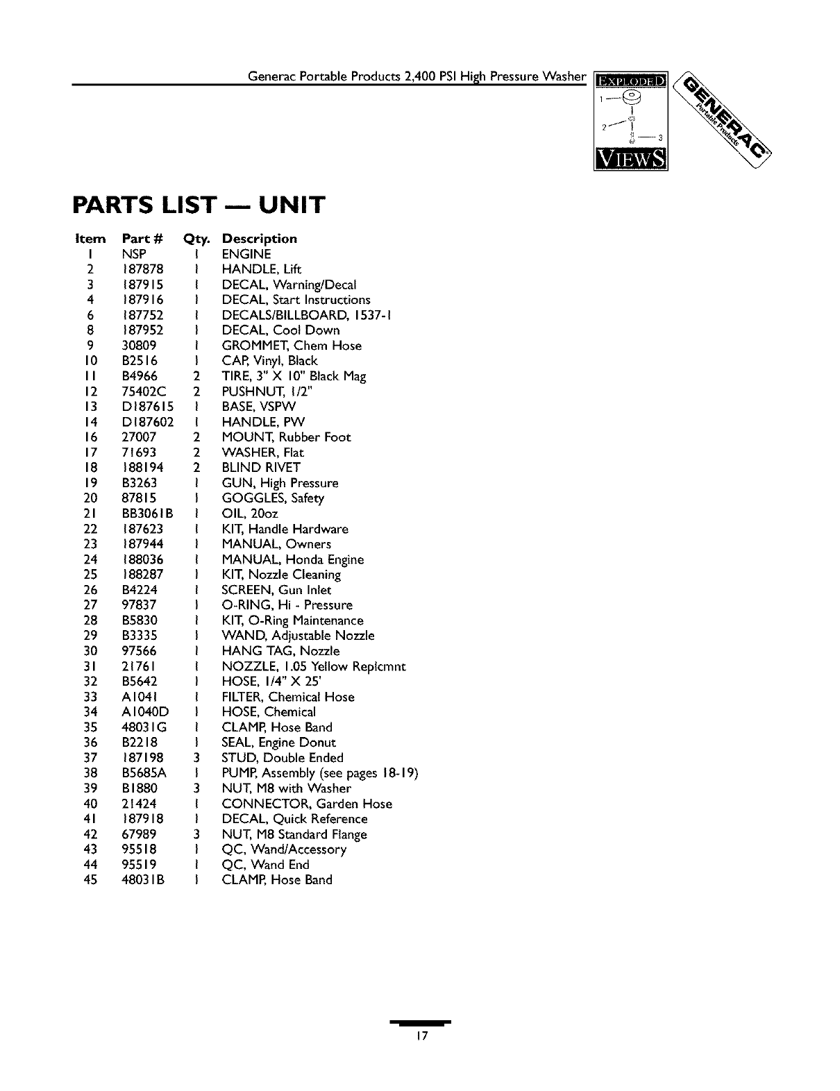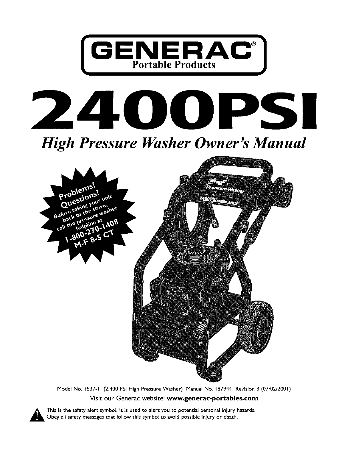 Model No. 1537-1 (2,400 PSI High Pressure Washer) Manual No. 187944 Revision 3 (07/02/2001)