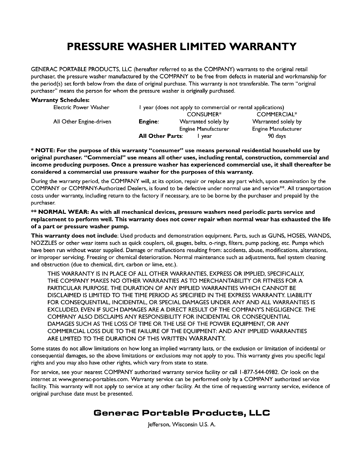 GENERAC PORTABLEPRODUCTS, LLC (hereafter referred to asthe COMPANY) warrants to the original retail