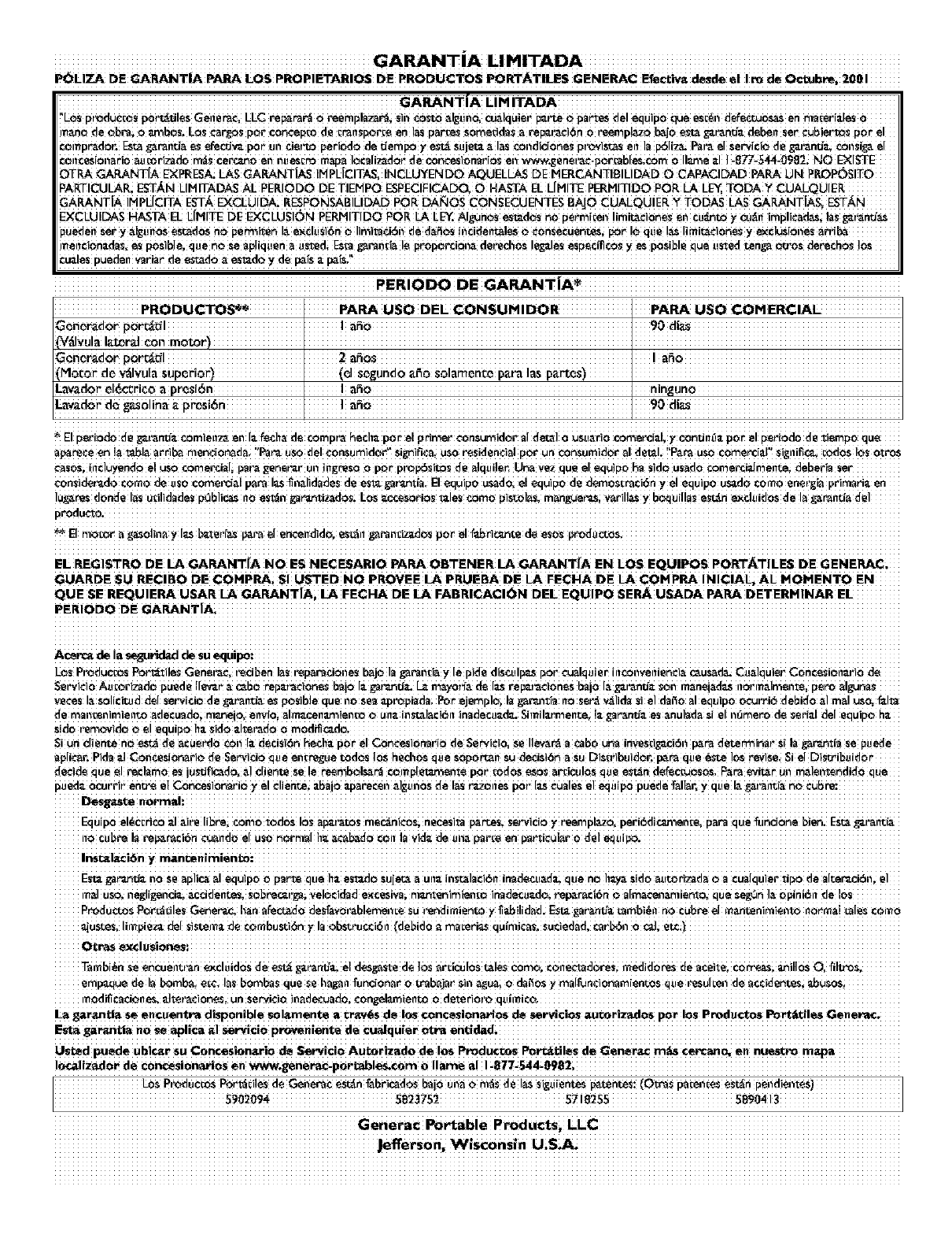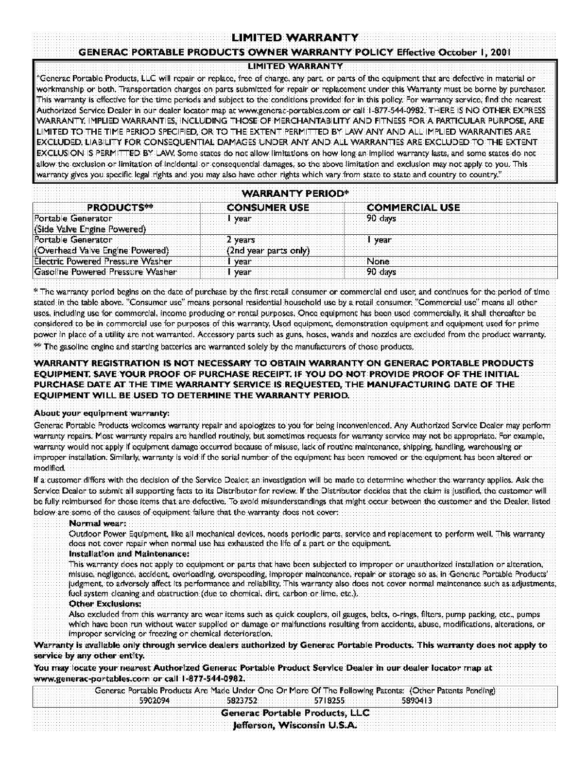 GENERAC PORTABLE PRODUCTS OWNER WARRANTY POLICY Effective October I_ 2001