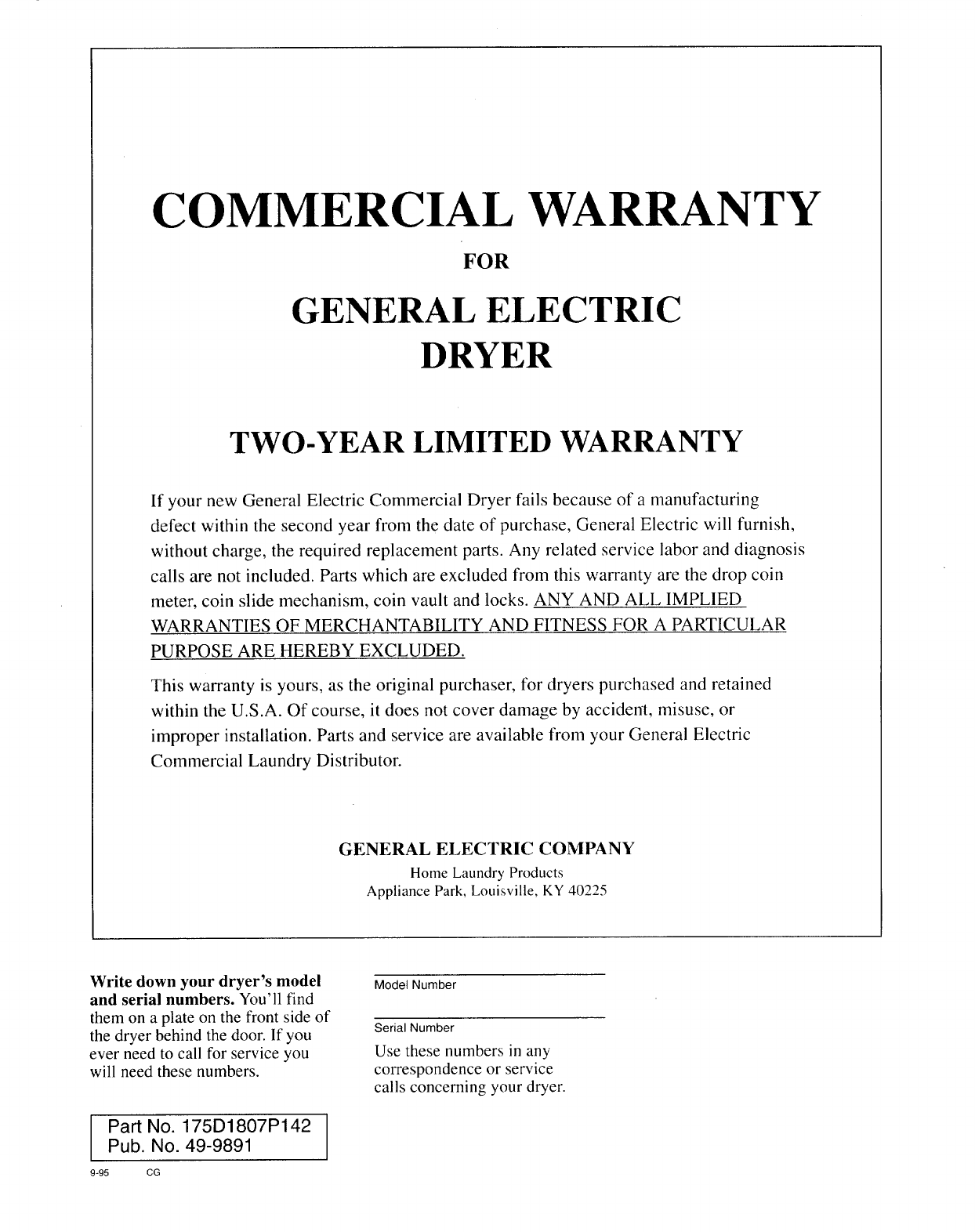 If your new General Electric Commercial Dryer fails because of amanufi~cturin&
