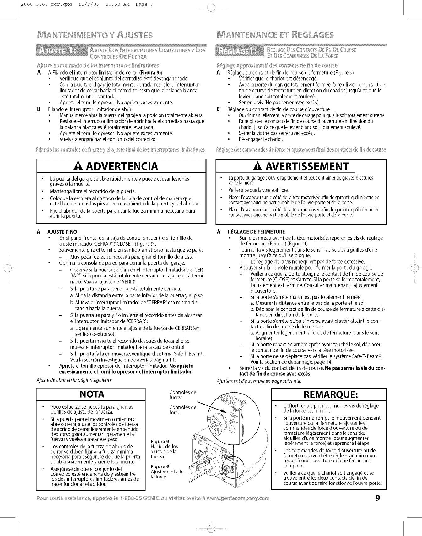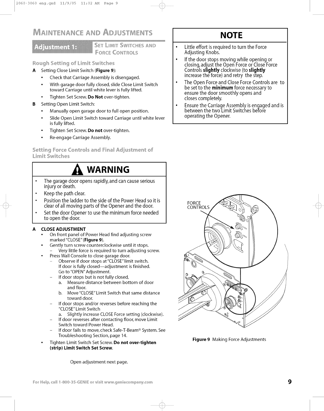 Carriage disengaged, ForceControl adjustments, door out of balance, broken springs