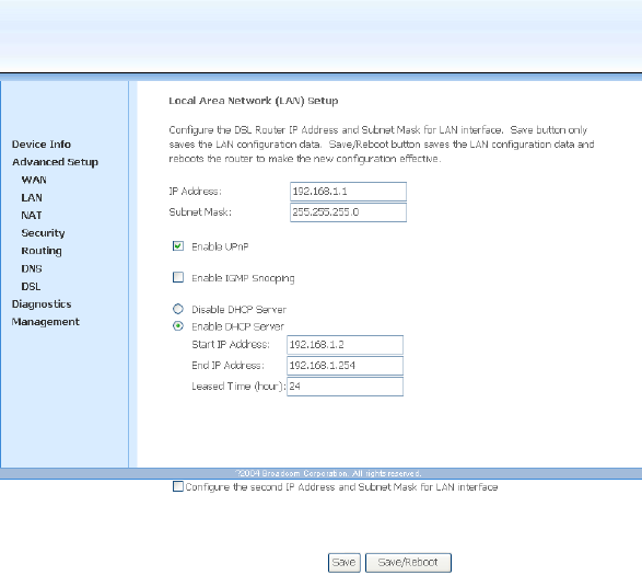 LAN IP address, subnet mask and gateway (IP address of LAN port on ADSL) must
