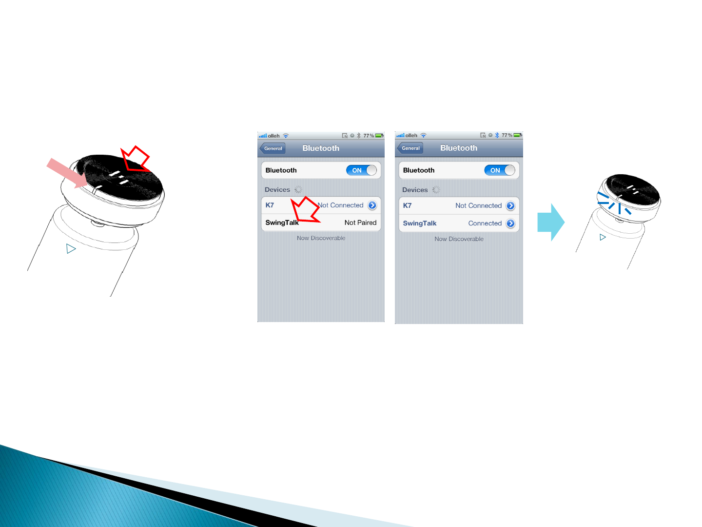1. Turn on the swingtalk 2. Connect to iOS devices