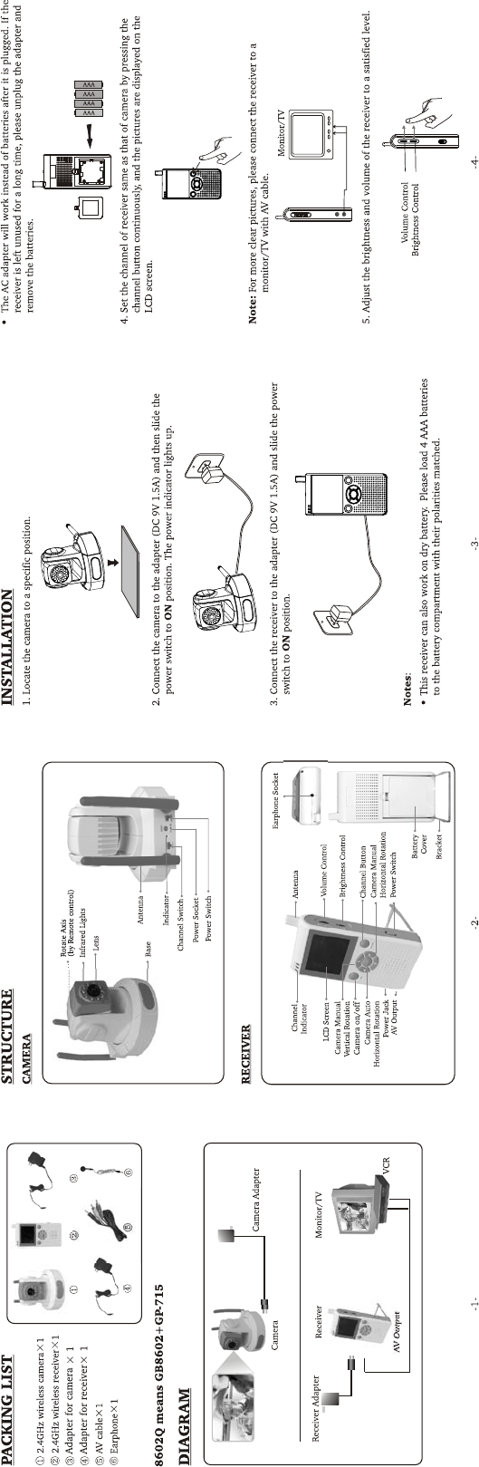 Gospell Smarthome Electronic GB8602 2.4GHz wireless A/V color camera User Manual