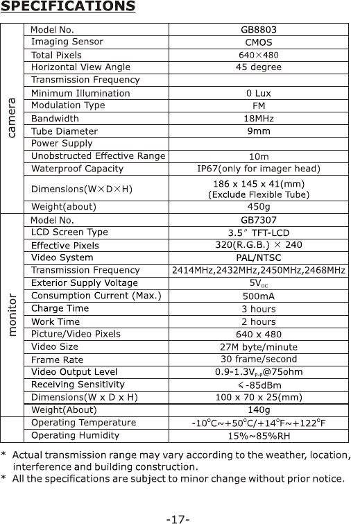 Gospell Smarthome Electronic GB8802-GB8803 Wireless Inspection Camera User Manual 8802AL